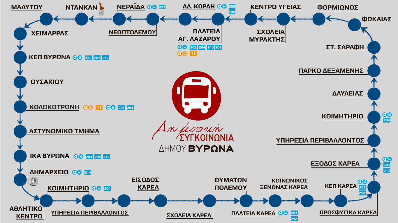 Τα λεωφορεία του Δήμου Βύρωνα μεταφέρουν τους επιβάτες προς την Τοπική Αγορά, τους κυριότερους Οργανισμούς Κοινής Ωφελείας και προορισμούς εντός του Δήμου μας, από Δευτέρα έως Σάββατο από τις 8.00 το πρωί έως τις 13.00 το μεσημέρι.