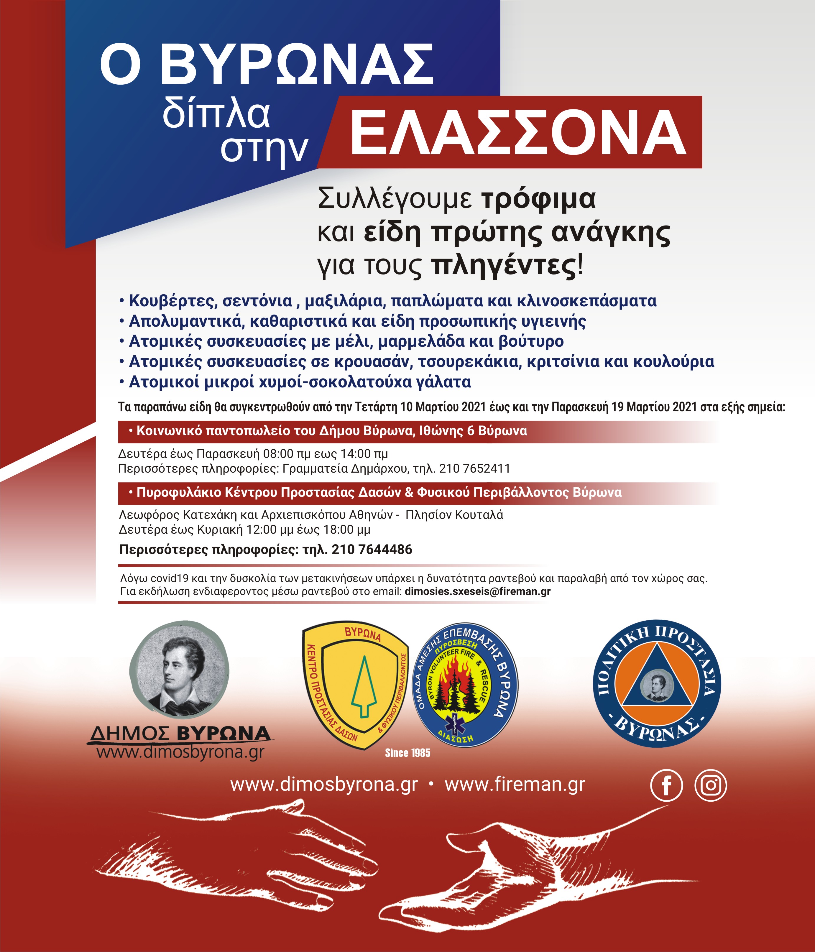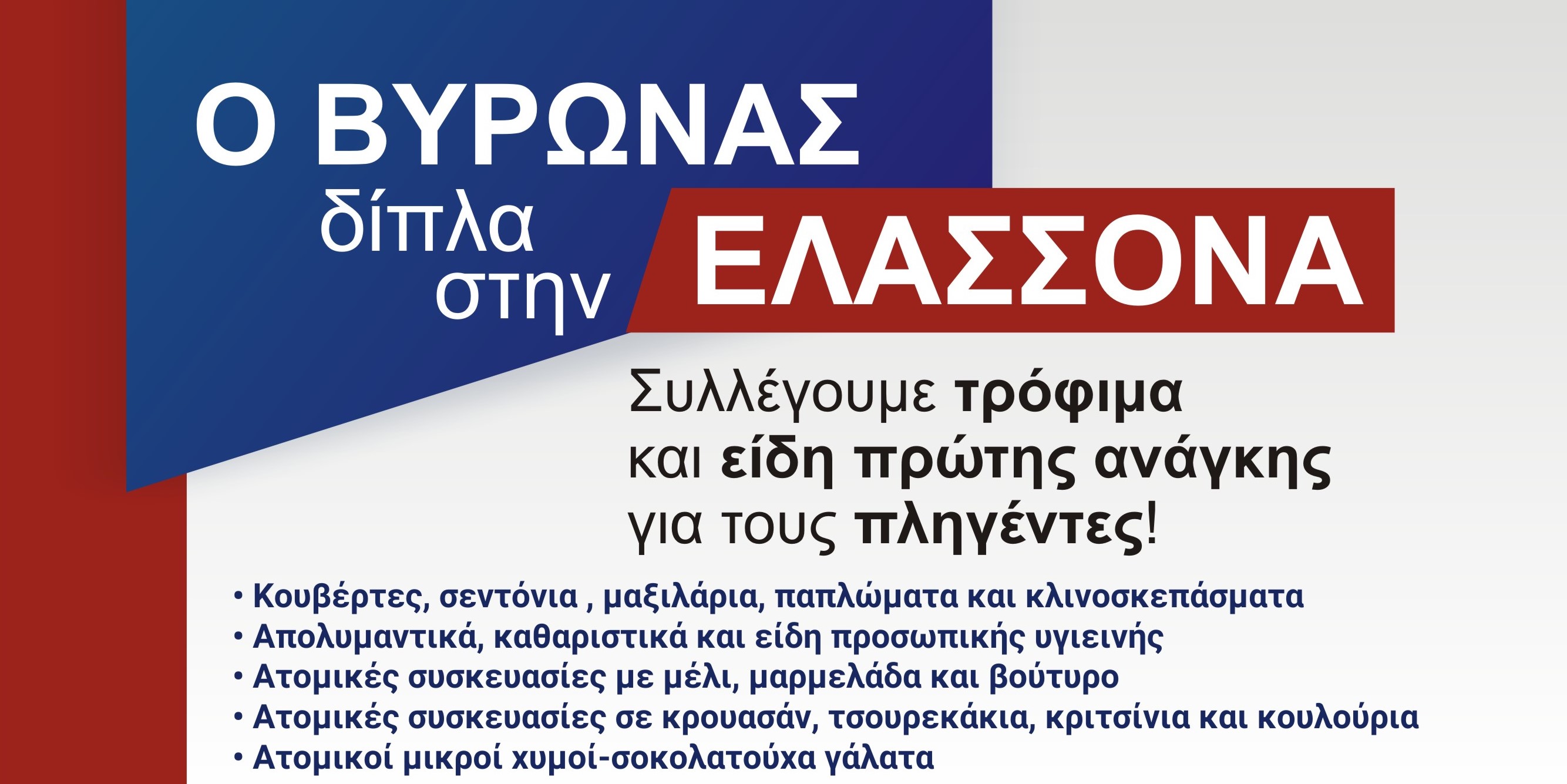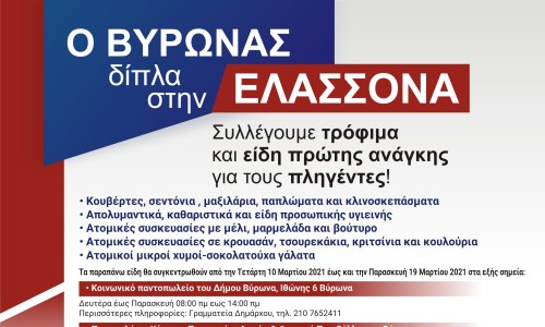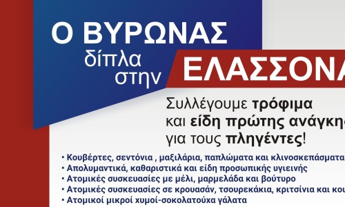 Ο Δήμος Βύρωνα και το Κέντρο Προστασίας Δασών & Φυσικού Περιβάλλοντος Βύρωνα συγκεντρώνουν είδη πρώτης ανάγκης για τους σεισμοπαθείς κατοίκους της Ελασσόνας και των γύρω περιοχών. Οι συμπολίτες μας που θέλουν να συμβάλουν μπορούν να προσφέρουν: