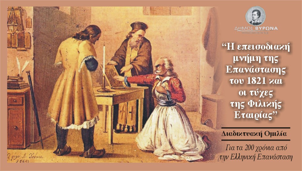 Ο Δήμος Βύρωνα σας προσκαλεί την Τετάρτη 24 Μαρτίου στις 19:00 στη διαδικτυακή ομιλία του ιστορικού, Μιχάλη Βαρλά, με θέμα: «Η επεισοδιακή μνήμη της Επανάστασης του 1821 και οι τύχες της Φιλικής Εταιρείας», στο πλαίσιο των εορτασμών για τα 200 χρόνια από την Ελληνική Επανάσταση. Μετά την ομιλία θα ακολουθήσει συζήτηση.