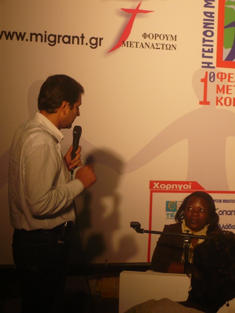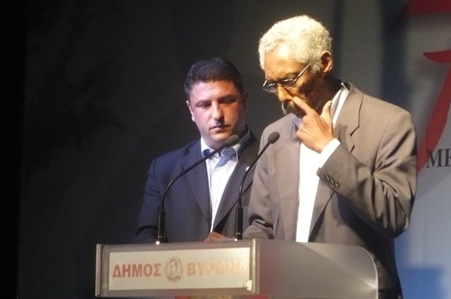 Ο Αχμέτ Μοαβία, συντονιστής του Ελληνικού Φόρουμ Μεταναστών, στο βήμα του Φεστιβάλ, με το Δήμαρχο Βύρωνα.