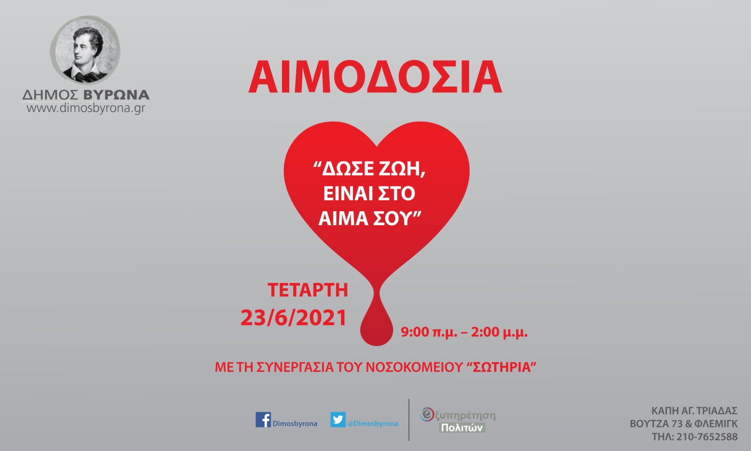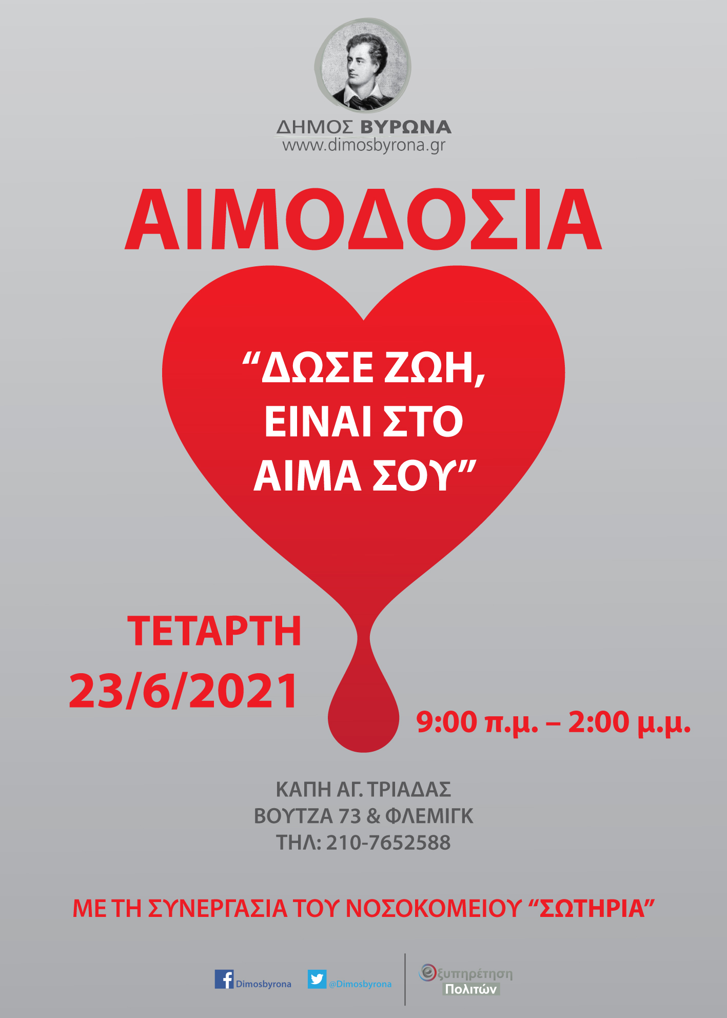 Ο Δήμος Βύρωνα σε συνεργασία με το Γ.Ν.Α. << ΣΩΤΗΡΙΑ >>, θα πραγματοποιήσει Εθελοντική Αιμοδοσία την Τετάρτη 23/6/2021 και ώρες 9:00 - 14:00, στο Κ.Α.Π.Η Αγίας Τριάδας, Βουτζά 73 & Φλέμινγκ (Εντευκτήριο Προσκόπων).