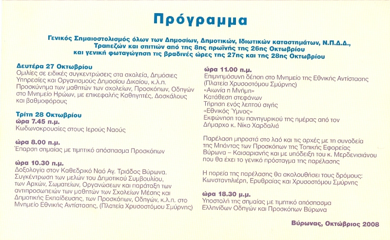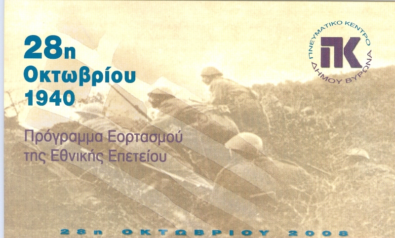 Ο Δήμαρχος Βύρωνα Νίκος Χαρδαλιάς και το Δημοτικό Συμβούλιο της πόλης, σας καλούν να πάρετε μέρος στις εκδηλώσεις που θα γίνουν για την Εθνική Επέτειο της 28ης Οκτωβρίου.