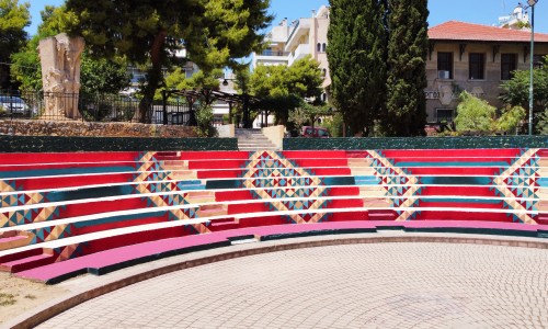 Η δημιουργία του street artist Achilles δανείζεται γεωμετρικά μοτίβα και χρώματα από τα παραδοσιακά χαλιά και κιλίμια που παρήγαγε κάποτε το ιστορικό προσφυγικό εργοστάσιο ταπητουργίας, το οποίο, ως διατηρητέο κτίριο, εξακολουθεί να στέκεται επιβλητικό πάνω από την κεντρική πλατεία.