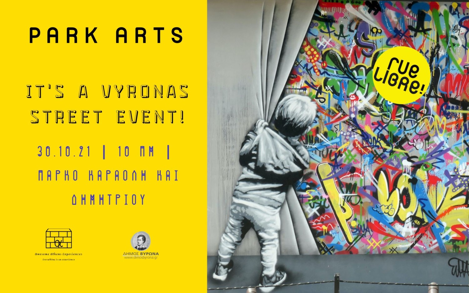 Έπειτα από τις πρόσφατες επιτυχημένες καλλιτεχνικές παρεμβάσεις που «μεταμόρφωσαν» κοινόχρηστους χώρους της πόλης μας, ο Δήμος Βύρωνα σε συνεργασία με την Awesome Athens Experiences συνεχίζει την προσπάθεια αισθητικής αναβάθμισης του δημόσιου χώρου με τη διοργάνωση του event Park Arts στο οποίο συμμετέχουν οι καλλιτέχνες: Mister.Achilles, Fotizontas, Noless.one, Otom.one, Norone, Μαριλένα Γκιρλέμη, (street art & graffiti).