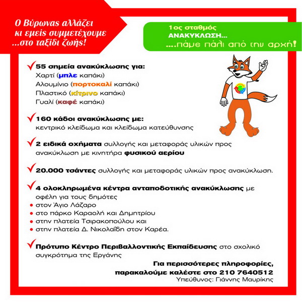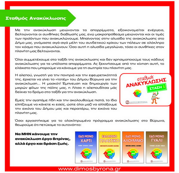 Πρόκειται για το πρώτο Δημόσιο Πρόγραμμα Ανακύκλωσης, πέρα από το πρόγραμμα των μπλε κάδων της Ε.Ε.Α.Α, που σχεδίασε ο Δήμος Βύρωνα και επισήμως ξεκινά στις 17 Νοεμβρίου 2008.