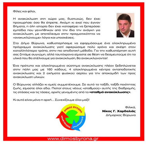 «Το μεγάλο ζητούμενο είναι η σωστή εκπαίδευση των πολιτών και ιδιαίτερα των μαθητών. Οι μαθητές μας, οι αυριανοί υπεύθυνοι πολίτες αυτού του τόπου, είναι οι πρώτοι που πρέπει να κατανοήσουν τη χρησιμότητα της ανακύκλωσης και για το λόγο αυτό, δημιουργούμε ένα Πρότυπο Κέντρο Περιβαλλοντικής Εκπαίδευσης στο Σχολικό συγκρότημα της Εργάνης. Είναι στο χέρι μας να μην κάνουμε την ανακύκλωση έργο βιτρίνας, αλλά έργο και δράση ζωής», δήλωσε μεταξύ άλλων κατά τη διάρκεια της συνέντευξης τύπου, ο Δήμαρχος Βύρωνα Νίκος Χαρδαλιάς.