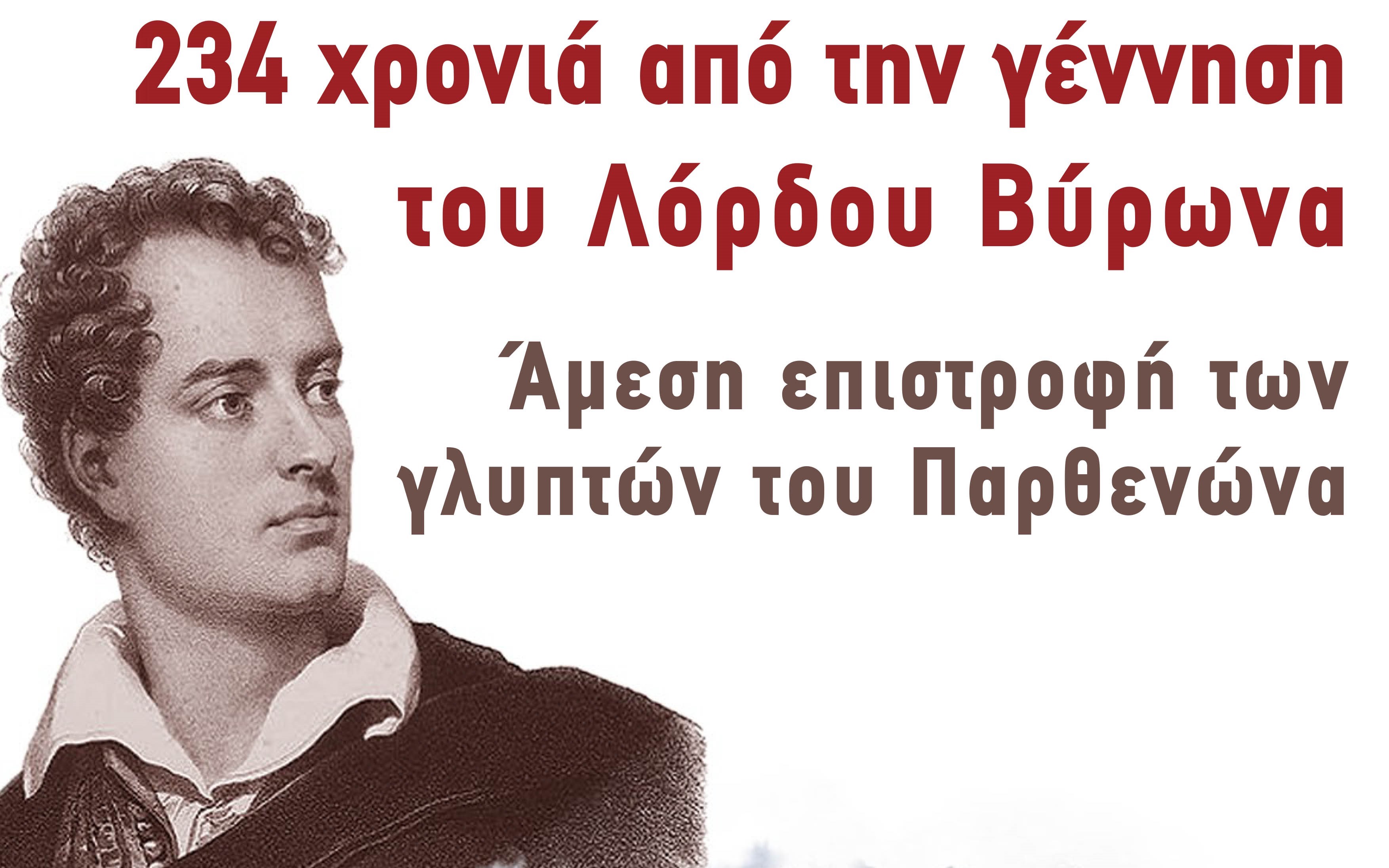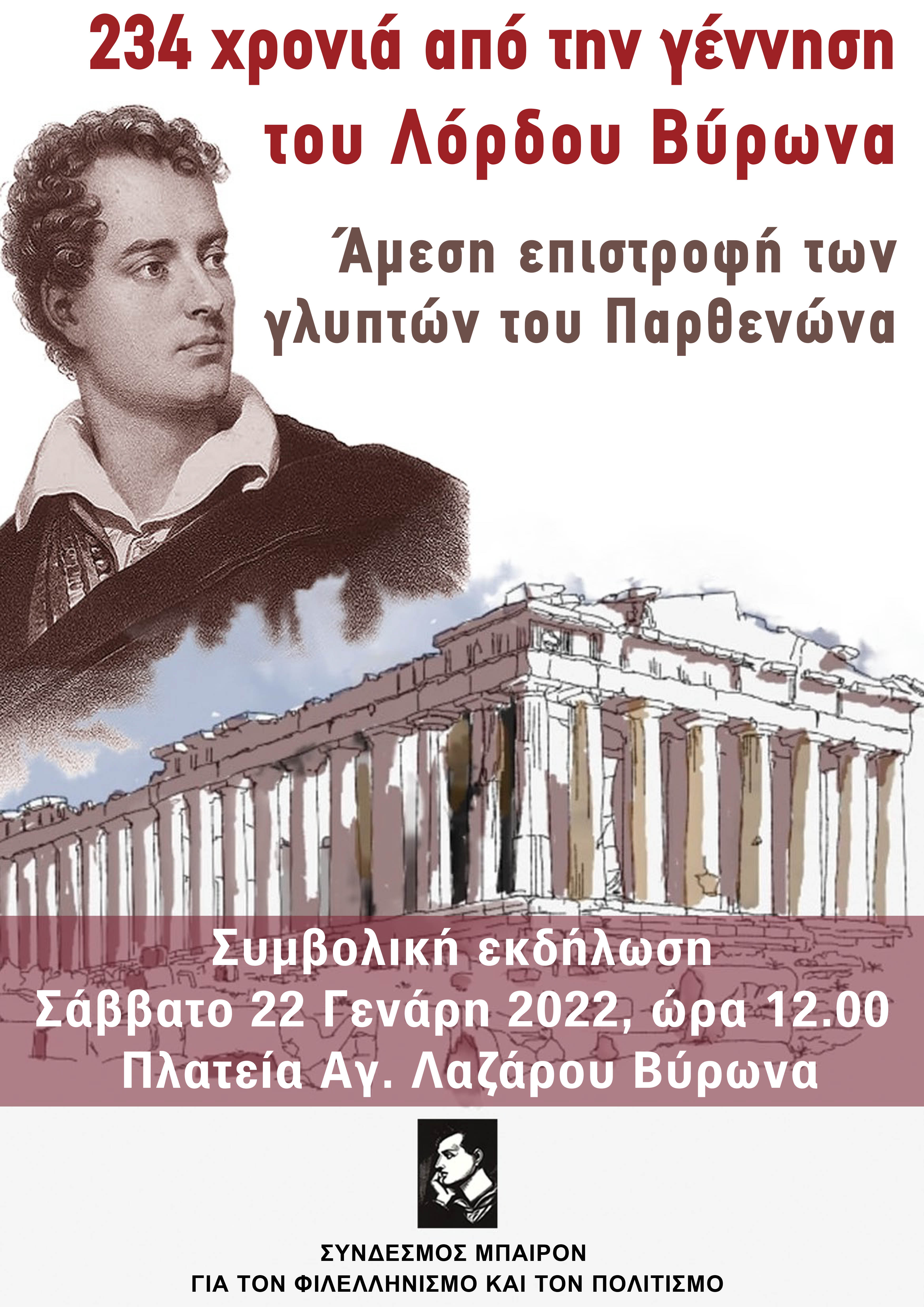 Με αφορμή τα 234 χρόνια από την γέννηση του Λόρδου Βύρωνα (22 Ιανουαρίου 1788), ο Σύνδεσμος Μπάιρον για τον Φιλελληνισμό και τον Πολιτισμό πραγματοποιεί συμβολική εκδήλωση για την επιστροφή των Γλυπτών του Παρθενώνα, των οποίων την κλοπή είχε καταγγείλει από το 1810 ο μεγάλος ποιητής και κορυφαίος των φιλελλήνων.