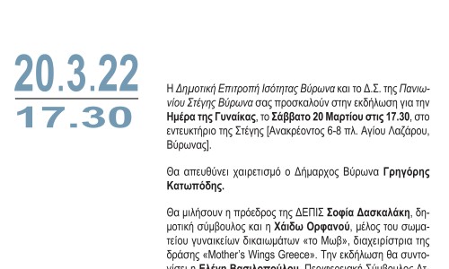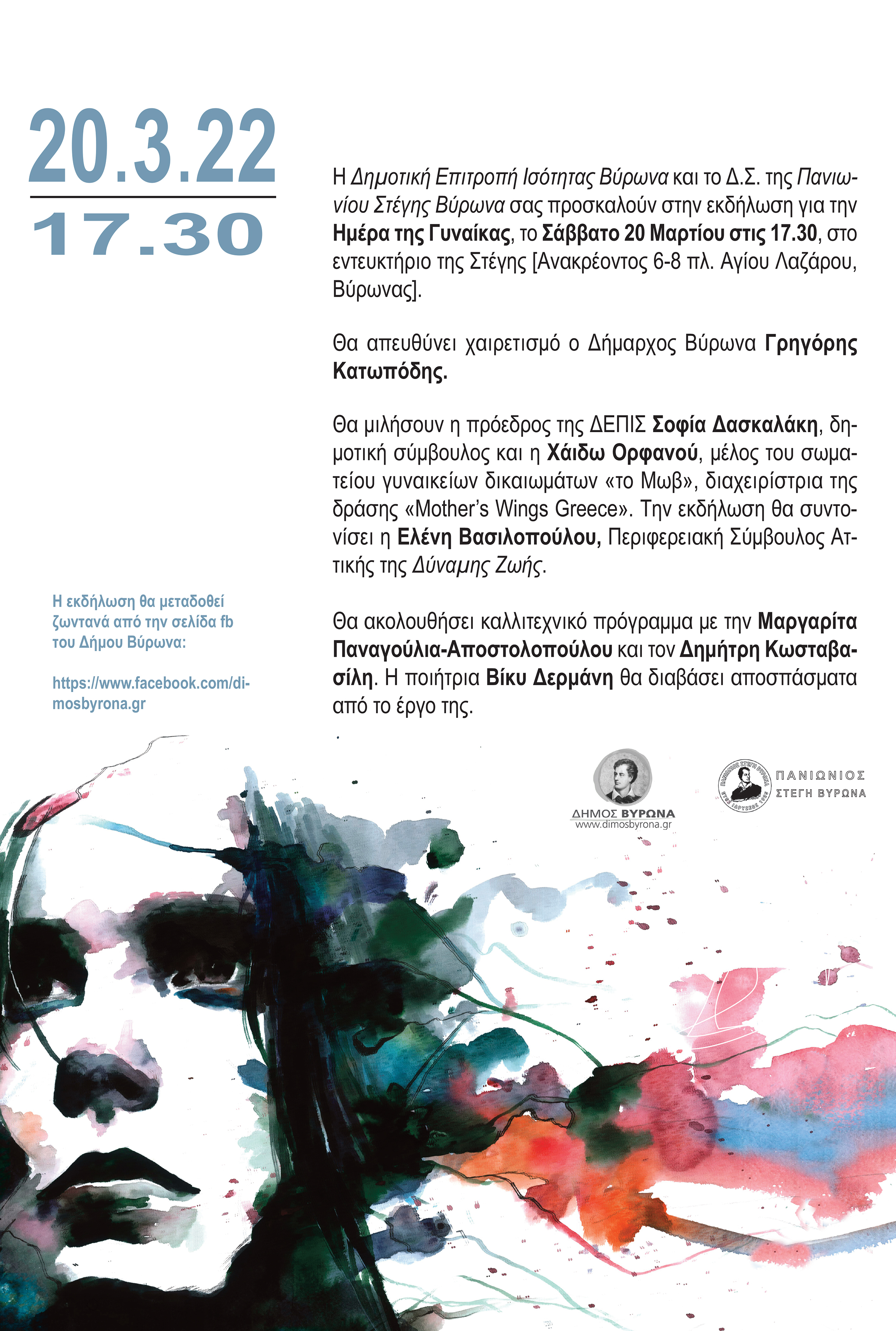 Tην Κυριακή 20 Μαρτίου 2022, στις 17:30 θα γίνει η εκδήλωση για την Ημέρα της Γυναίκας, που είχε προγραμματιστεί για το Σάββατο 12 Μαρτίου, από τη Δημοτική Επιτροπή Ισότητας (ΔΕΠΙΣ) Βύρωνα και το Δ.Σ. της Πανιωνίου Στέγης, αλλά αναβλήθηκε λόγω πρόβλεψης της ΕΜΥ για κακοκαιρία.