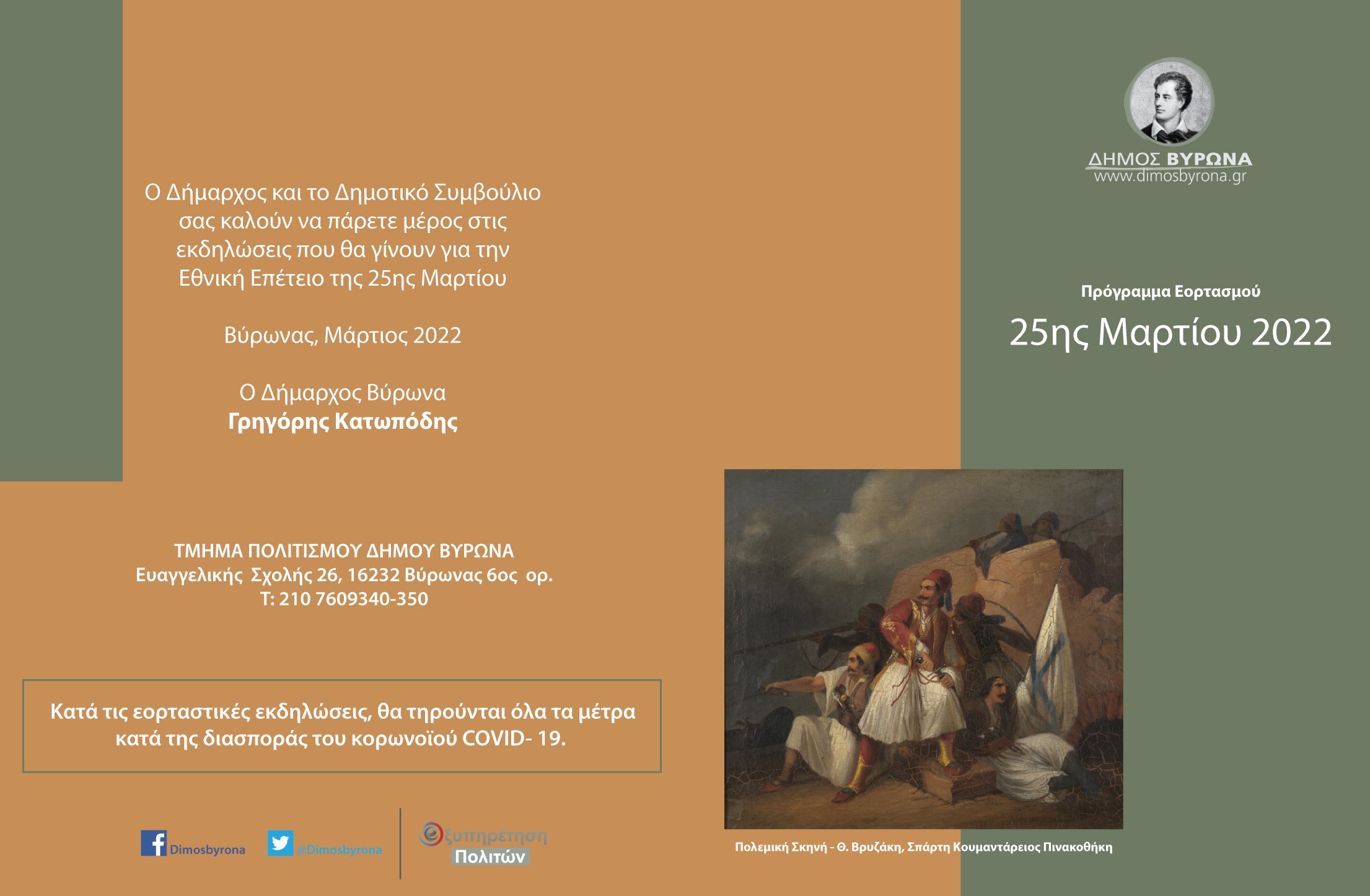 Λόγω της νέας μεγάλης αύξησης των κρουσμάτων κορονοϊού το τελευταίο διάστημα και κατόπιν αιτήματος των διευθυντών όλων των σχολείων του Δήμου Βύρωνα, στην φετινή παρέλαση για την 25η Μαρτίου θα συμμετέχουν ΜΟΝΟ 6μελείς αντιπροσωπείες μαθητών και φορέων με τη σημαία και το λάβαρο τους.