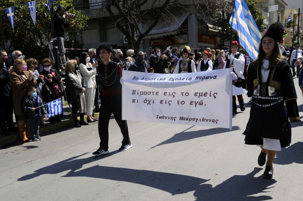 Εξαιτίας της νέας μεγάλης αύξησης των κρουσμάτων κορονοϊού το τελευταίο διάστημα και κατόπιν αιτήματος των διευθυντών όλων των σχολείων του Δήμου Βύρωνα, στην φετινή παρέλαση για την 25η Μαρτίου συμμετείχαν ΜΟΝΟ 6μελείς αντιπροσωπείες μαθητών και φορέων με τη σημαία και το λάβαρο τους. Για όλους τους συμμετέχοντες στις επετειακές εκδηλώσεις, ήταν υποχρεωτική η πιστή τήρηση των ατομικών μέτρων κατά της διασποράς του κορονοϊού COVID- 19.