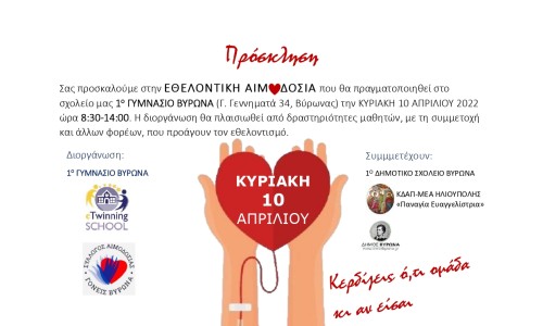 Την Κυριακή 10 Απριλίου 2022 και ώρα 8.00 - 14.00, θα πραγματοποιηθεί Εθελοντική Αιμοδοσία, στο 1ο Γυμνάσιο Βύρωνα (Γ. Γεννηματά 34).