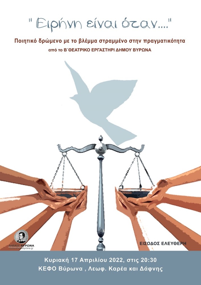 Την Κυριακή 17 Απριλίου, το Β' Θεατρικό εργαστήρι του Δήμου Βύρωνα, παρουσιάζει ένα ποιητικό δρώμενο, στο ΚΕΦΟ Καρέα (Λ. Καρέα & Δάφνης) και ώρα 8.30 μ.μ.