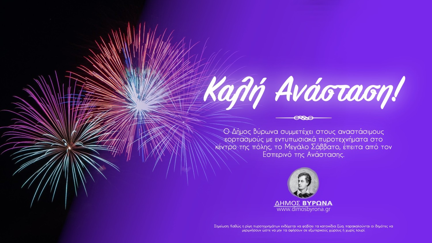 Ο Δήμος Βύρωνα συμμετέχει και φέτος (όπως και πέρυσι για πρώτη φορά) στους εορτασμούς της Ανάστασης με ένα εντυπωσιακό σόου με βεγγαλικά, στο κέντρο της πόλης, το Μεγάλο Σάββατο, έπειτα από τον εσπερινό της Ανάστασης!