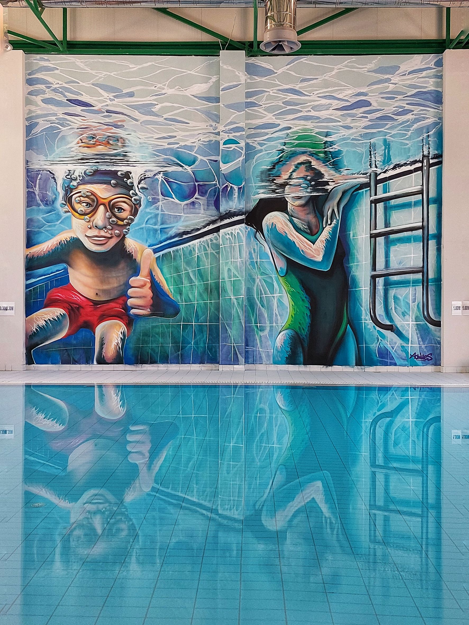 Το έργο φιλοτεχνήθηκε από τον γνωστό street artist Αχιλλέα aka Mister.Achilles και αποτελεί μια εντυπωσιακή σε μέγεθος, χαρούμενη εικαστική παρέμβαση, έναν ύμνο στις μικρές χαρές της ζωής, την επαφή με το υγρό στοιχείο και την άθληση.