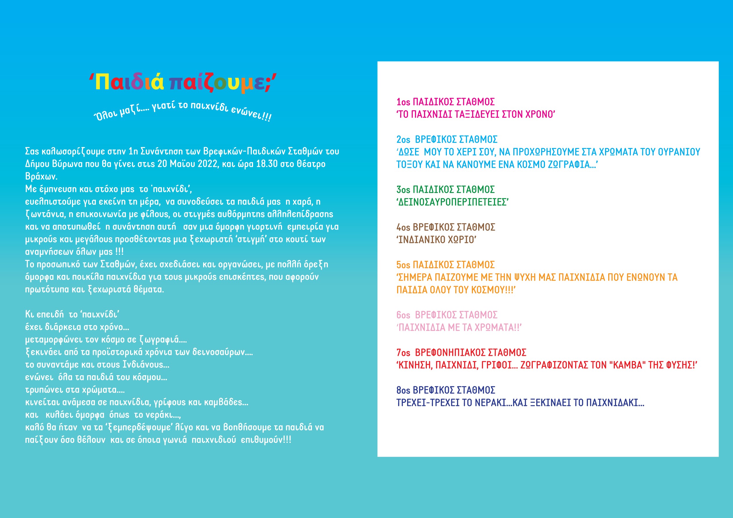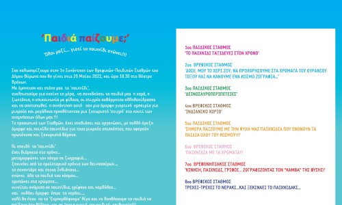 Με έμπνευση το ‘παιχνίδι’ και στόχο μας τα παιδιά να βιώσουν μια γιορτινή εμπειρία γεμάτη χαρά, επικοινωνία με φίλους και στιγμές αυθόρμητης, ανέμελης έκφρασης, σας προσκαλούμε την Παρασκευή 20/5/22 ώρα 6.30 μ.μ. στο θέατρο Βράχων.
