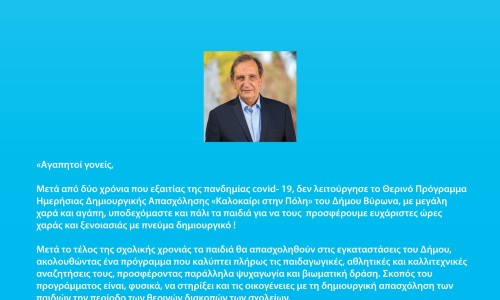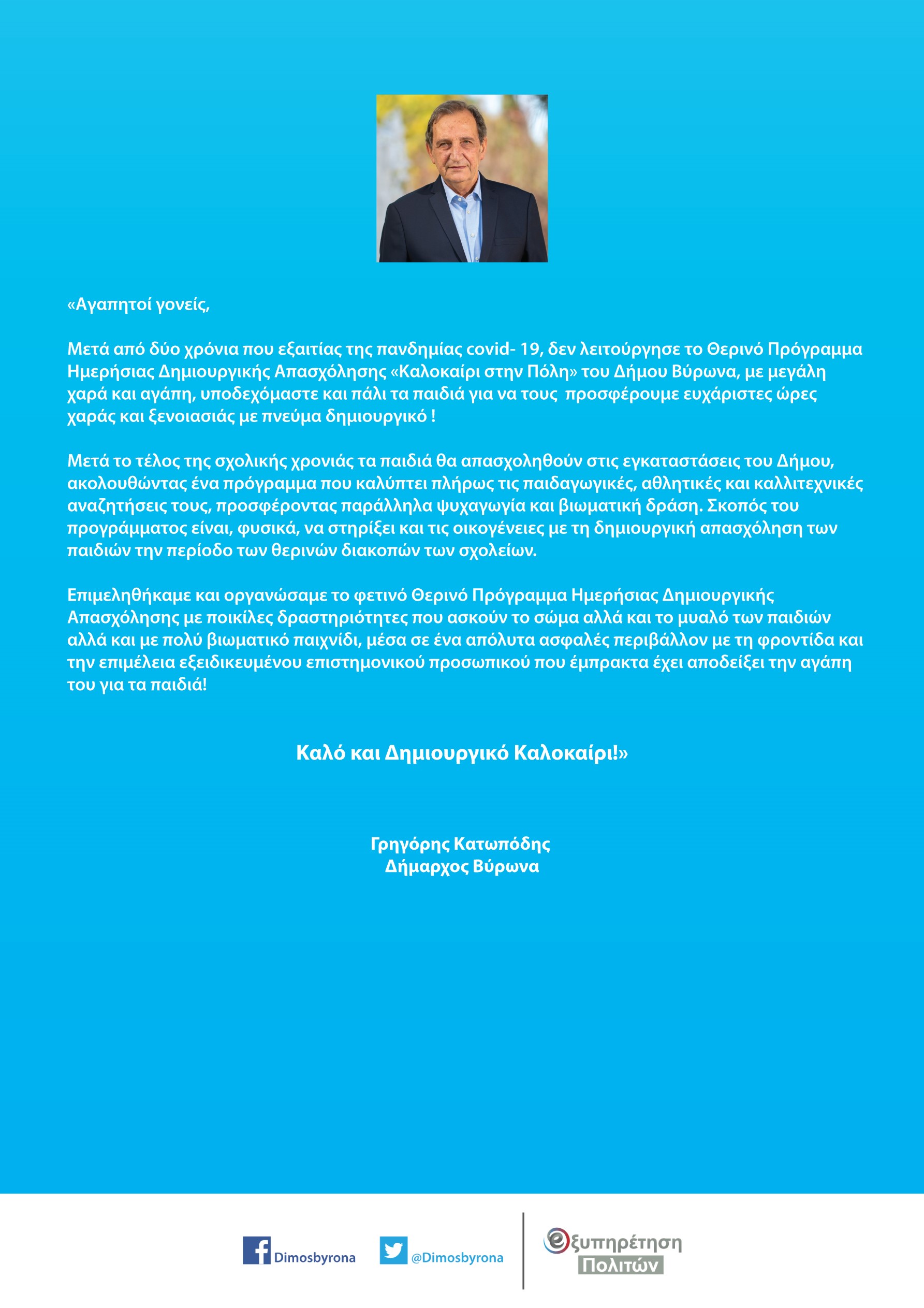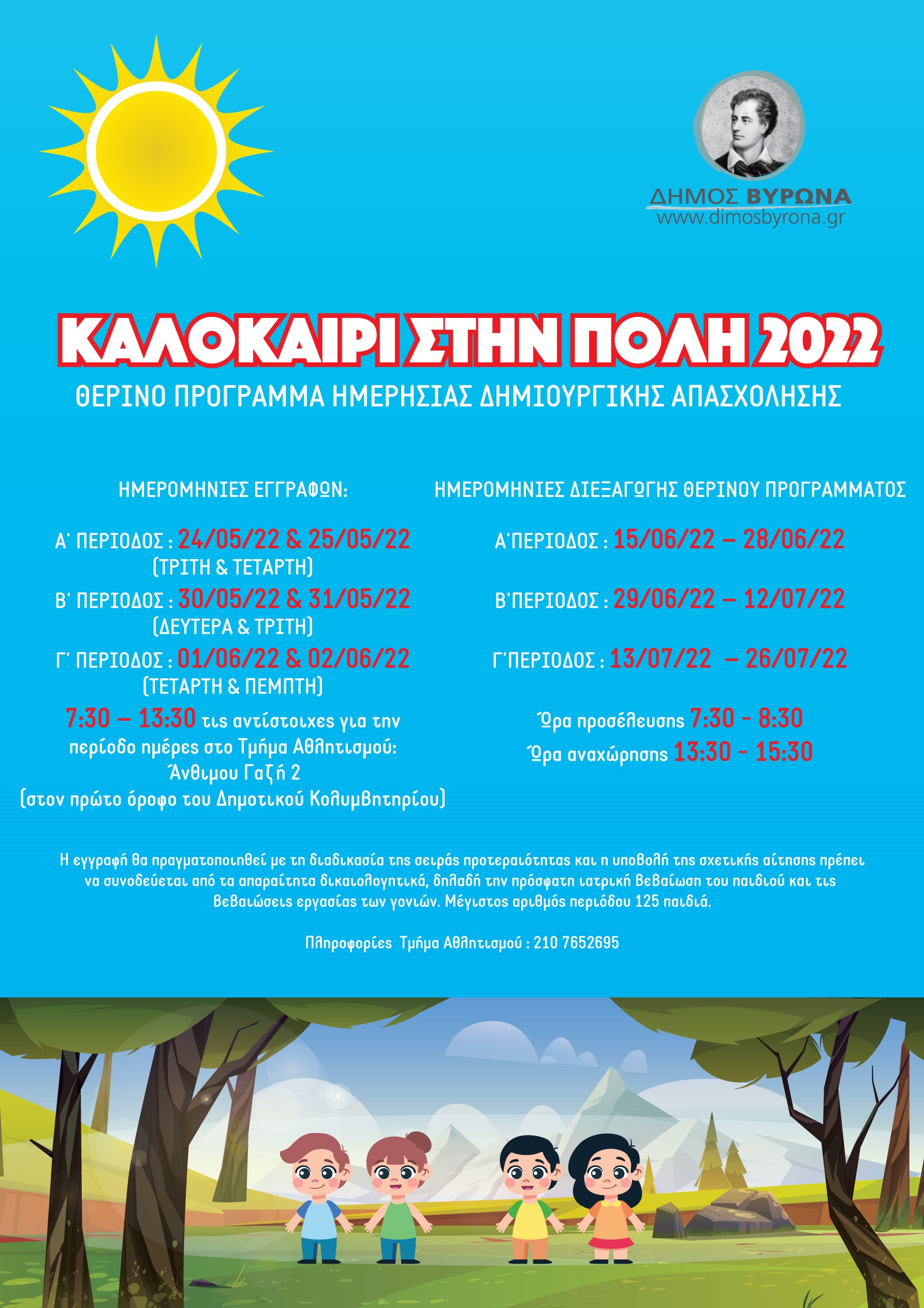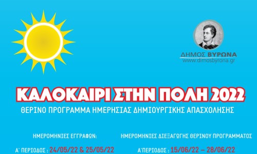 Μετά από δύο χρόνια που εξαιτίας της πανδημίας covid- 19, δεν λειτούργησε το Θερινό Πρόγραμμα Ημερήσιας Δημιουργικής Απασχόλησης «Καλοκαίρι στην Πόλη» του Δήμου Βύρωνα, με μεγάλη χαρά και αγάπη, υποδεχόμαστε και πάλι τα παιδιά για να τους προσφέρουμε ευχάριστες ώρες χαράς και ξενοιασιάς με πνεύμα δημιουργικό !