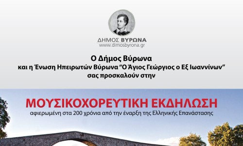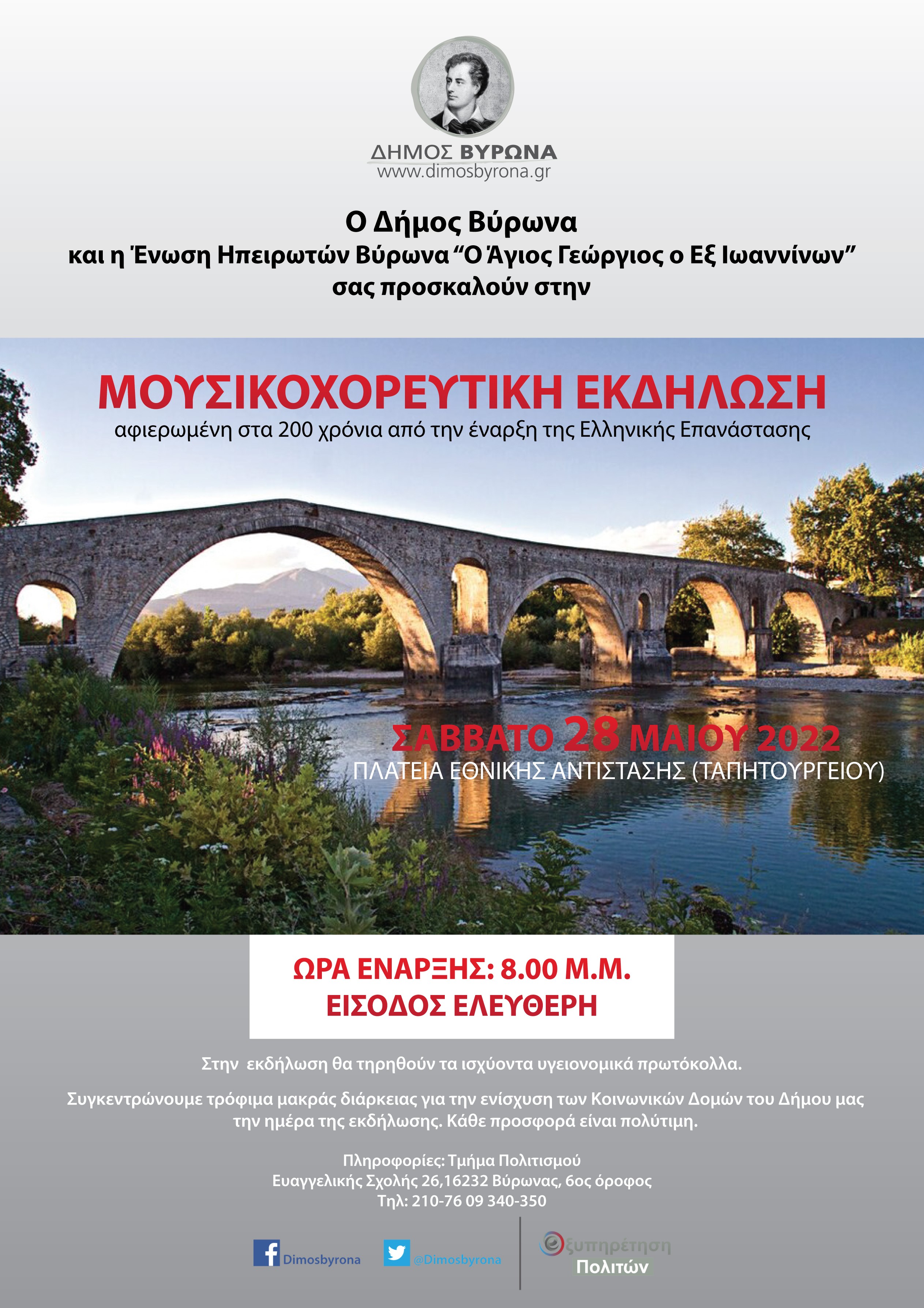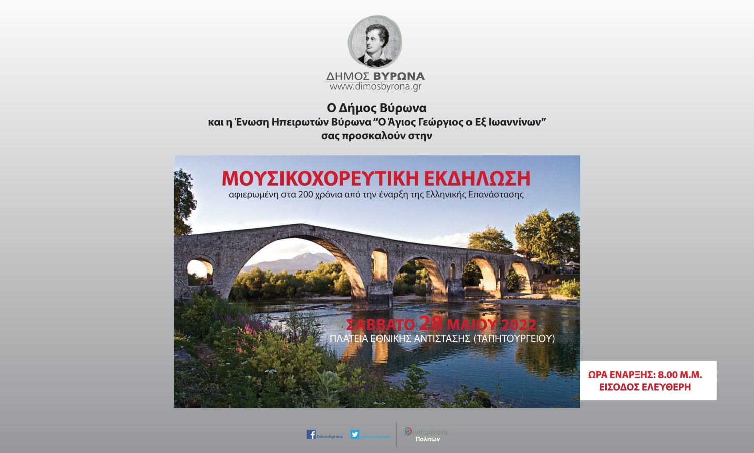 Ο Δήμος Βύρωνα και ή Ένωση Ηπειρωτών Βύρωνα «Ο Άγιος Γεώργιος ο Εξ Ιωαννίνων» σας προσκαλούν σε μία μουσικοχορευτική εκδήλωση αφιερωμένη στα 200 χρόνια από την έναρξη της Ελληνικής Επανάστασης, το Σάββατο 28 Μαΐου 2022, στην Πλατεία Εθνικής Αντίστασης (Πλ. Ταπητουργείου) και ώρα 8.00 μ.μ.