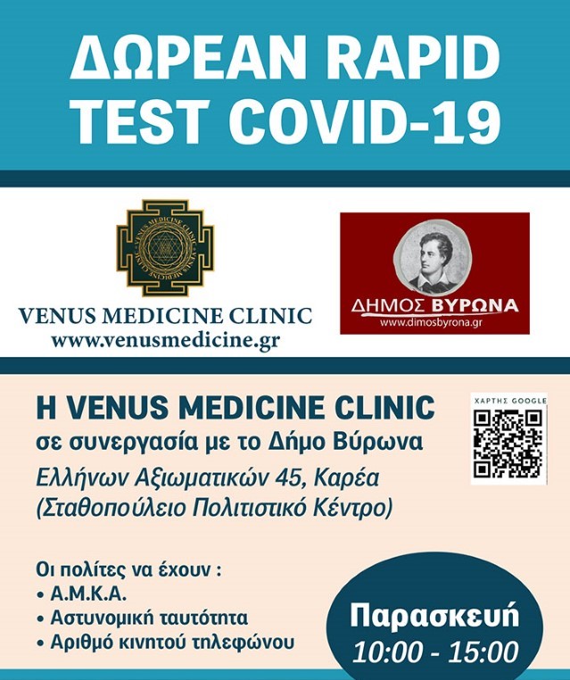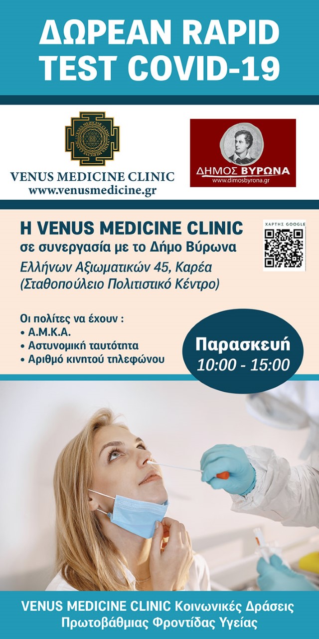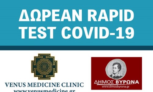 Η Venus Medicine Clinic σε συνεργασία με τον Δήμο Βύρωνα, προσφέρουν δωρεάν rapid test Covid-19, από σήμερα και κάθε Παρασκευή από τις 10:00 έως τις 15:00, στην οδό Ελλήνων Αξιωματικών 45 στον Καρέα (Σταθοπούλειο Πολιτιστικό Κέντρο).