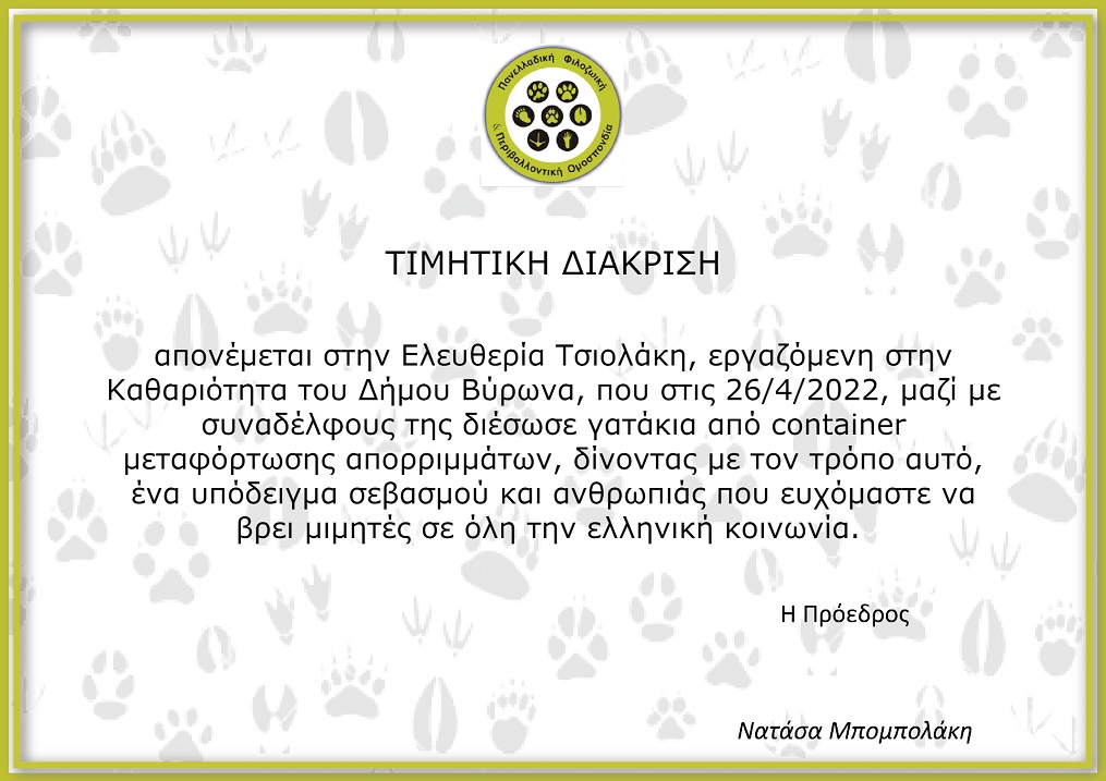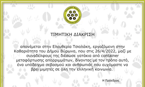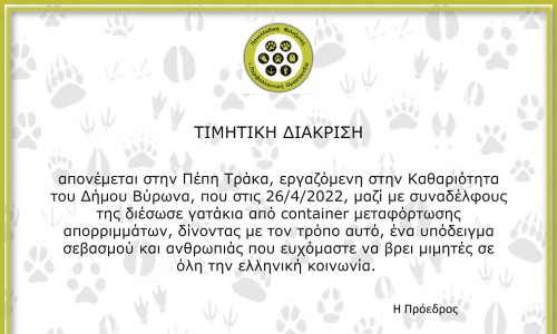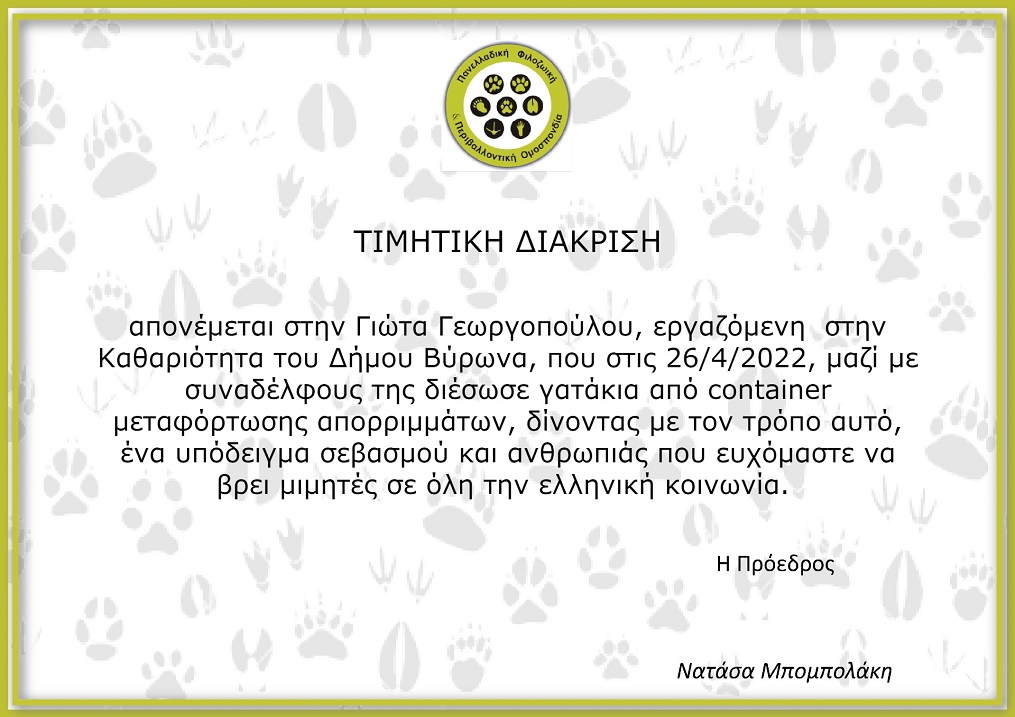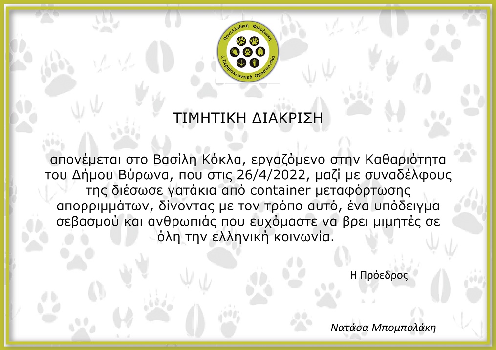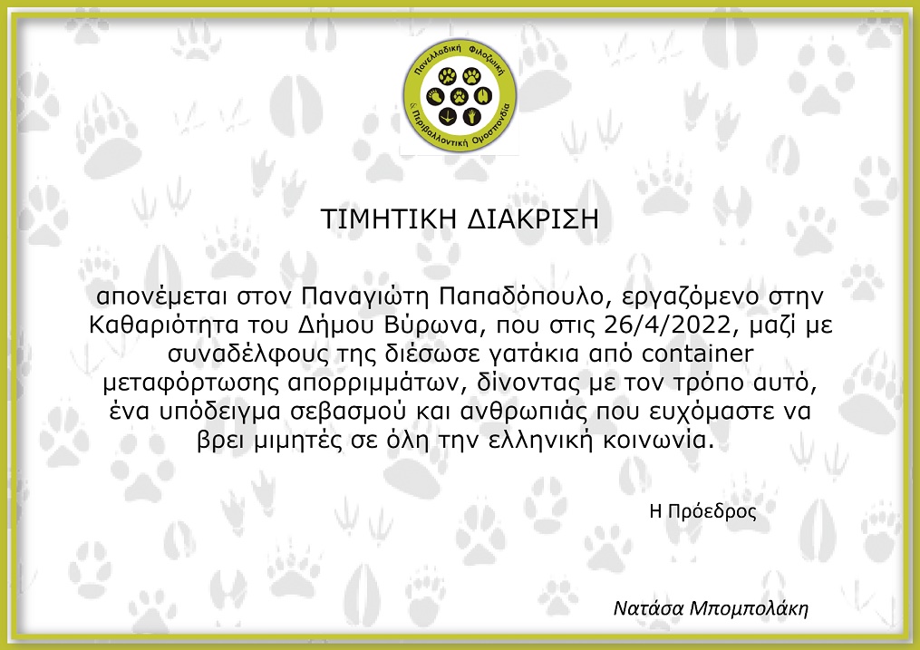 Τιμητικές διακρίσεις απένειμε η Πανελλαδική Φιλοζωική και Περιβαλλοντική Ομοσπονδία (ΠΦΠΟ) σε 6 εργαζόμενες και εργαζόμενους στην υπηρεσία καθαριότητας του Δήμου Βύρωνα, για την διάσωση μικρών γατιών που βρέθηκαν μέσα κοντέινερ ανακύκλωσης χαρτιού, αφού πρώτα είχαν πεταχτεί σε κάδο.