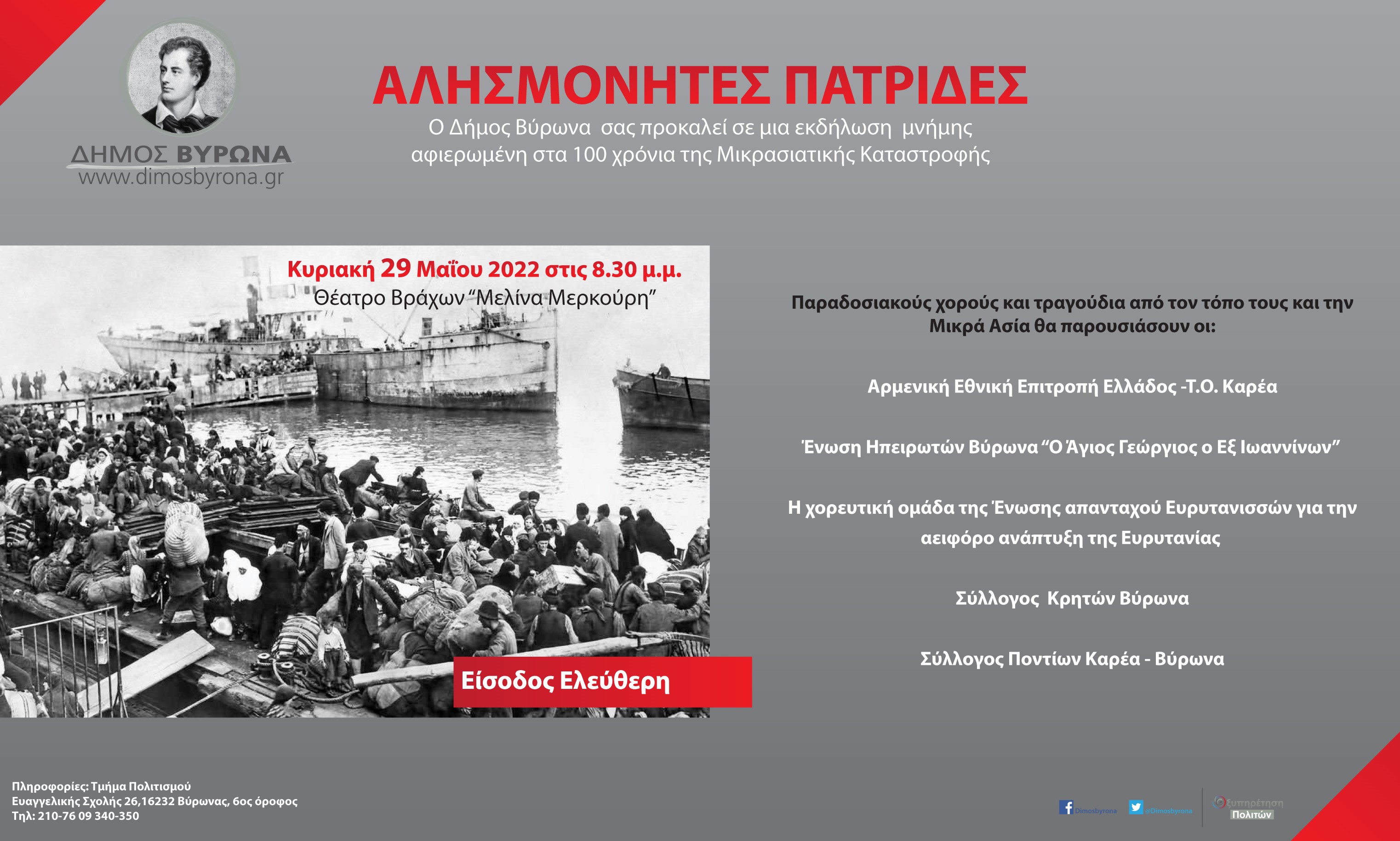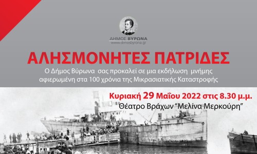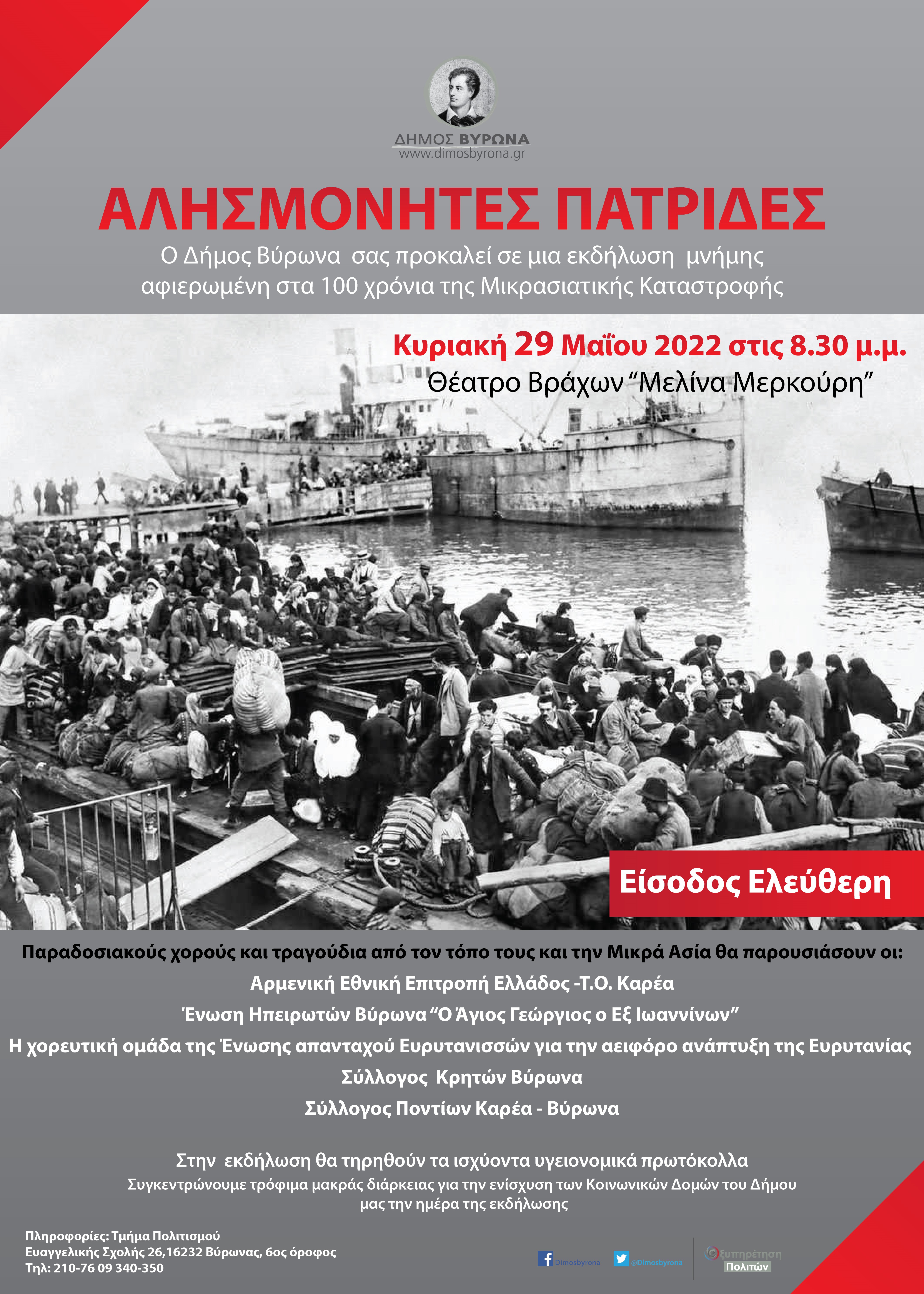 Ο Δήμος Βύρωνα σας προκαλεί σε μια εκδήλωση μνήμης αφιερωμένη στα 100 χρόνια της Μικρασιατικής Καταστροφής, την Κυριακή 29 Μαΐου 2022 στις 8.30 μ.μ. στο Θέατρο Βράχων «Μελίνα Μερκούρη».