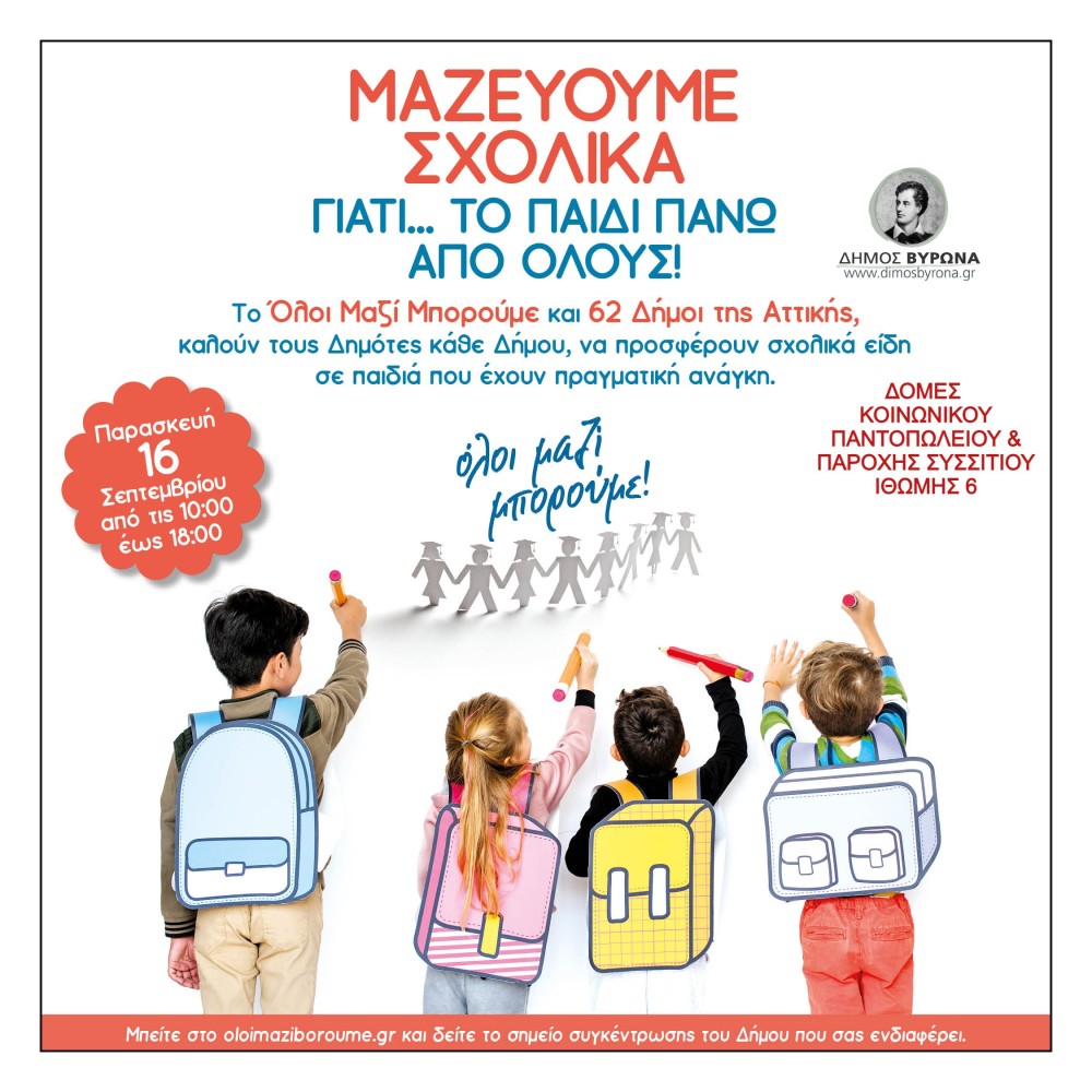 Ο Βύρωνας και άλλοι 61 Δήμοι της Αττικής, σε συνεργασία με το «Όλοι Μαζί Μπορούμε» καλούν τους πολίτες, να προσφέρουν σχολικά είδη για τα παιδιά που έχουν ανάγκη, ενόψει της έναρξης της νέας σχολικής χρονιάς.
