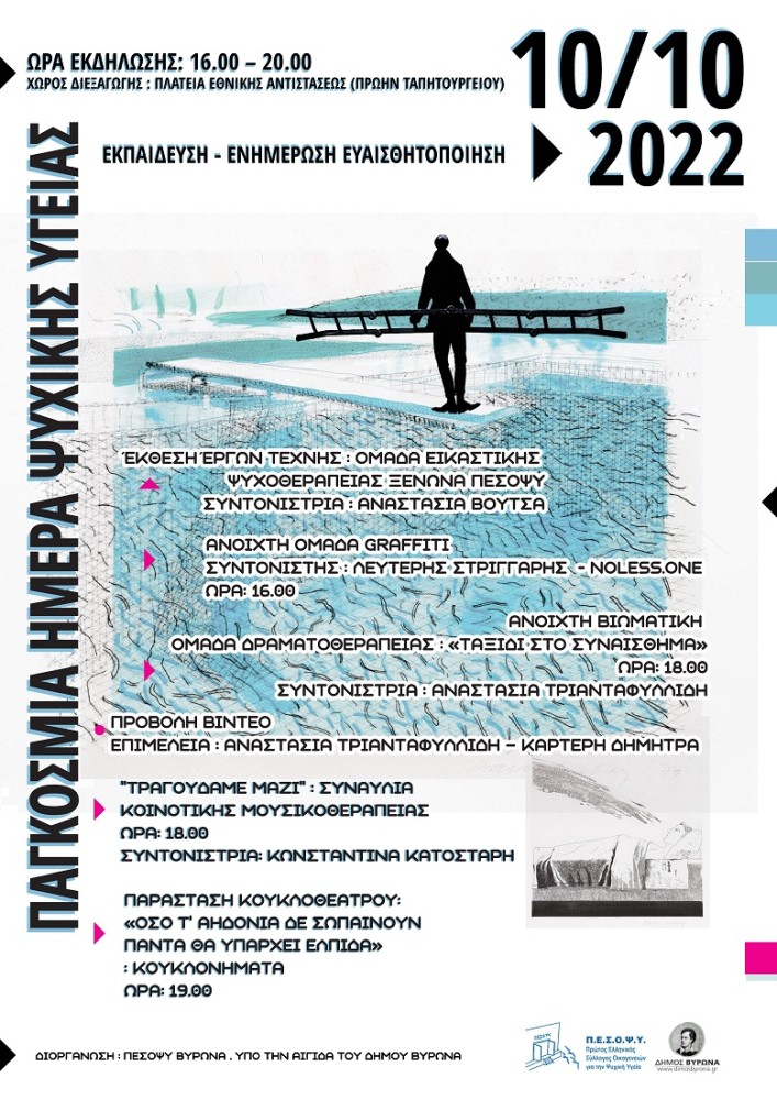 Με αφορμή την Παγκόσμια Ημέρα Ψυχικής Υγείας στις 10 Οκτώβρη, ο Πρώτος Ελληνικός Σύλλογος Οικογενειών Ψυχικής Υγείας (ΠΕΣΟΨΥ Βύρωνα), διοργανώνει, κοινοτική δράση με θέμα: «Ας κάνουμε την ψυχική υγεία & την ευεξία για όλους παγκόσμια προτεραιότητα», στην Πλατεία Εθνικής Αντιστάσεως (Ταπητουργείου), υπό την αιγίδα του Δήμου Βύρωνα.