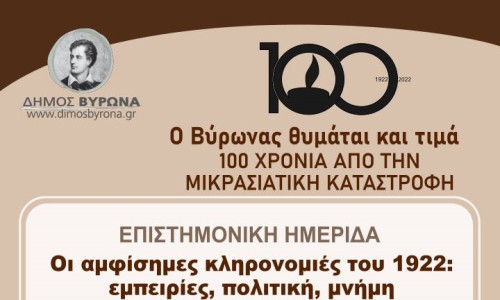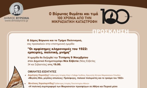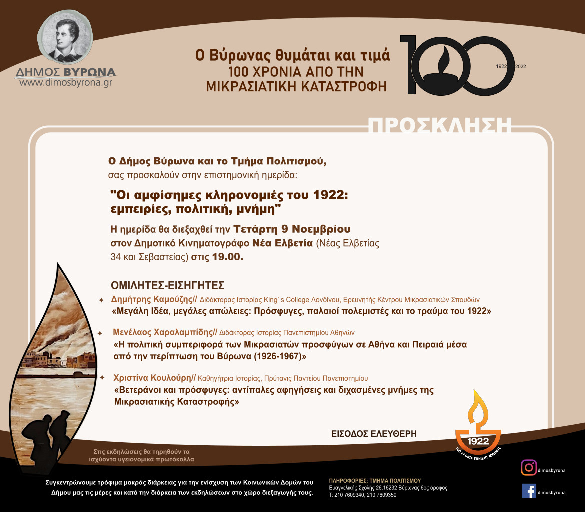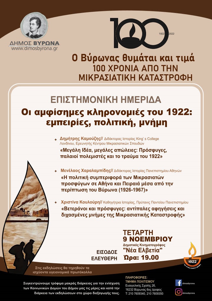 Ο Δήμος Βύρωνα σας προσκαλεί την Τετάρτη 9 Νοεμβρίου, στις 19:00 στο Δημοτικό Κινηματογράφο, Νέα Ελβετία (Νέας Ελβετίας 34 & Σεβαστείας) στην επιστημονική ημερίδα: «Οι αμφίσημες κληρονομιές του 1922, εμπειρίες, πολιτική, μνήμη», που εντάσσεται στο πλαίσιο των εκδηλώσεων για τη συμπλήρωση των 100 χρόνων από τη Μικρασιατική Καταστροφή. Η ημερίδα ήταν αρχικά προγραμματισμένη για τις 2/11 αλλά για τεχνικούς λόγους, μεταφέρθηκε σε νέα ημερομηνία στις 9/11".