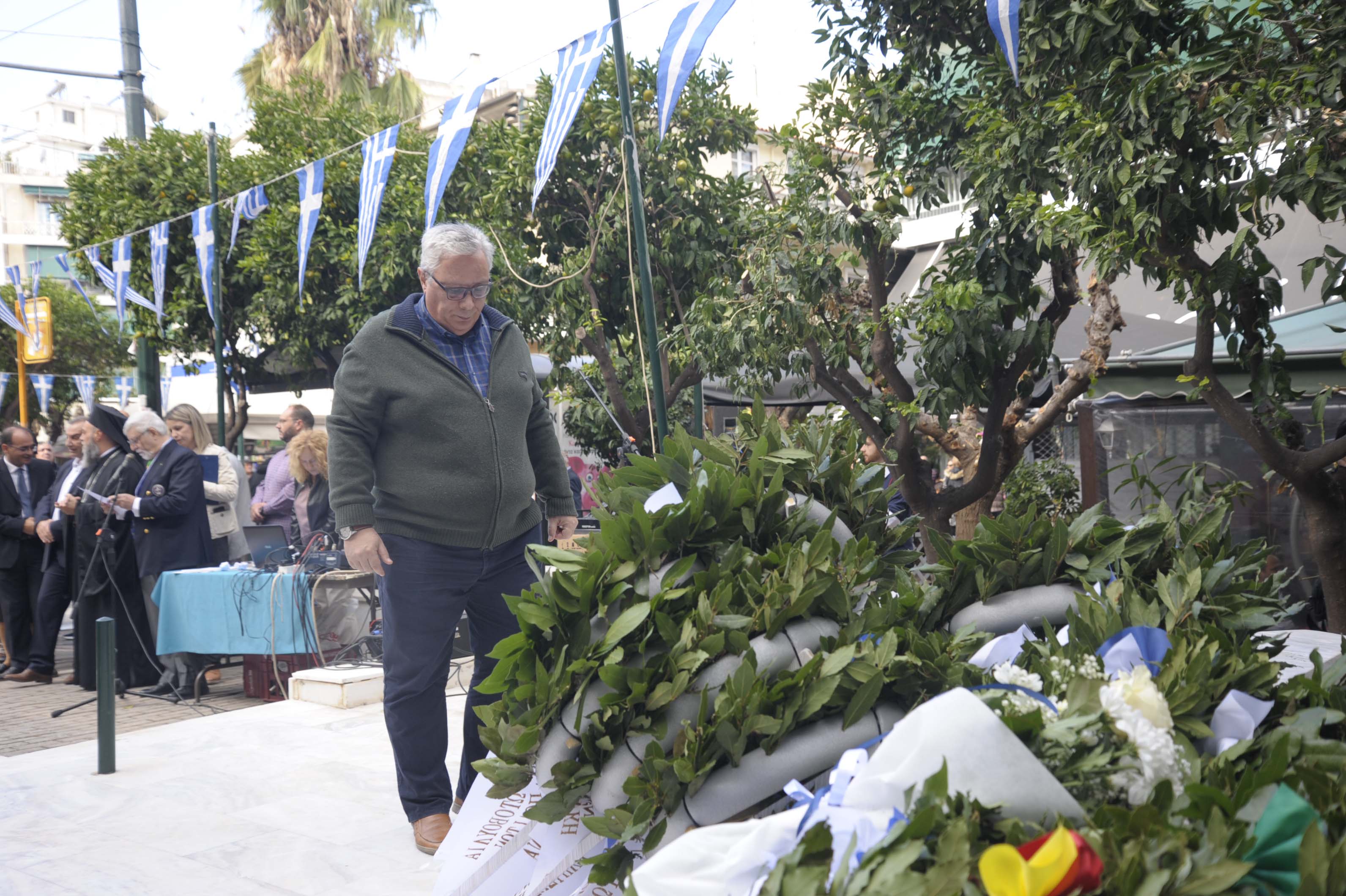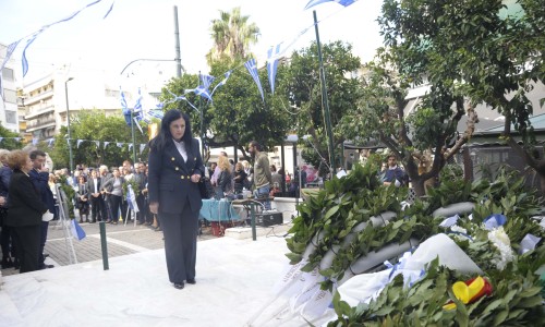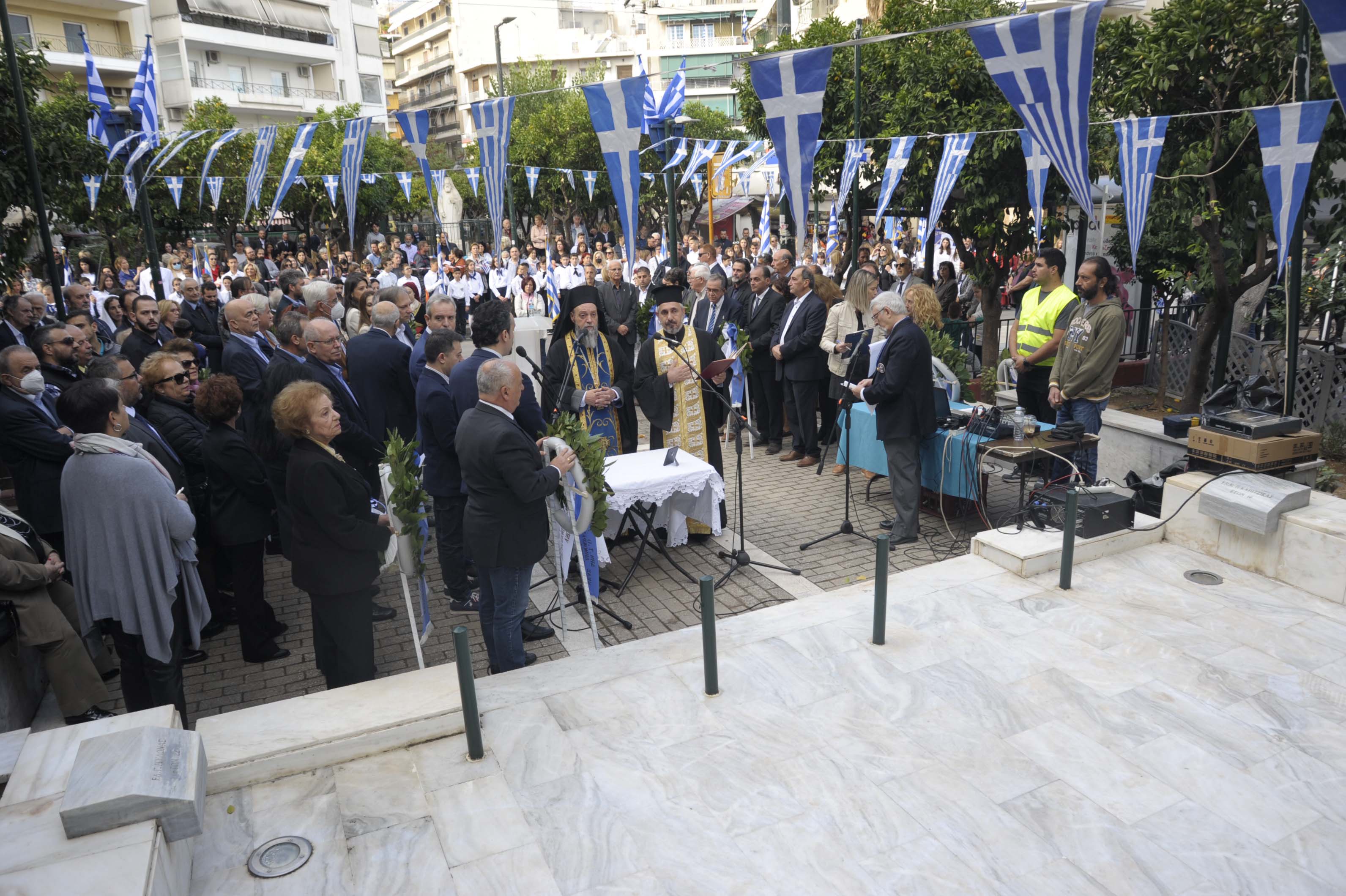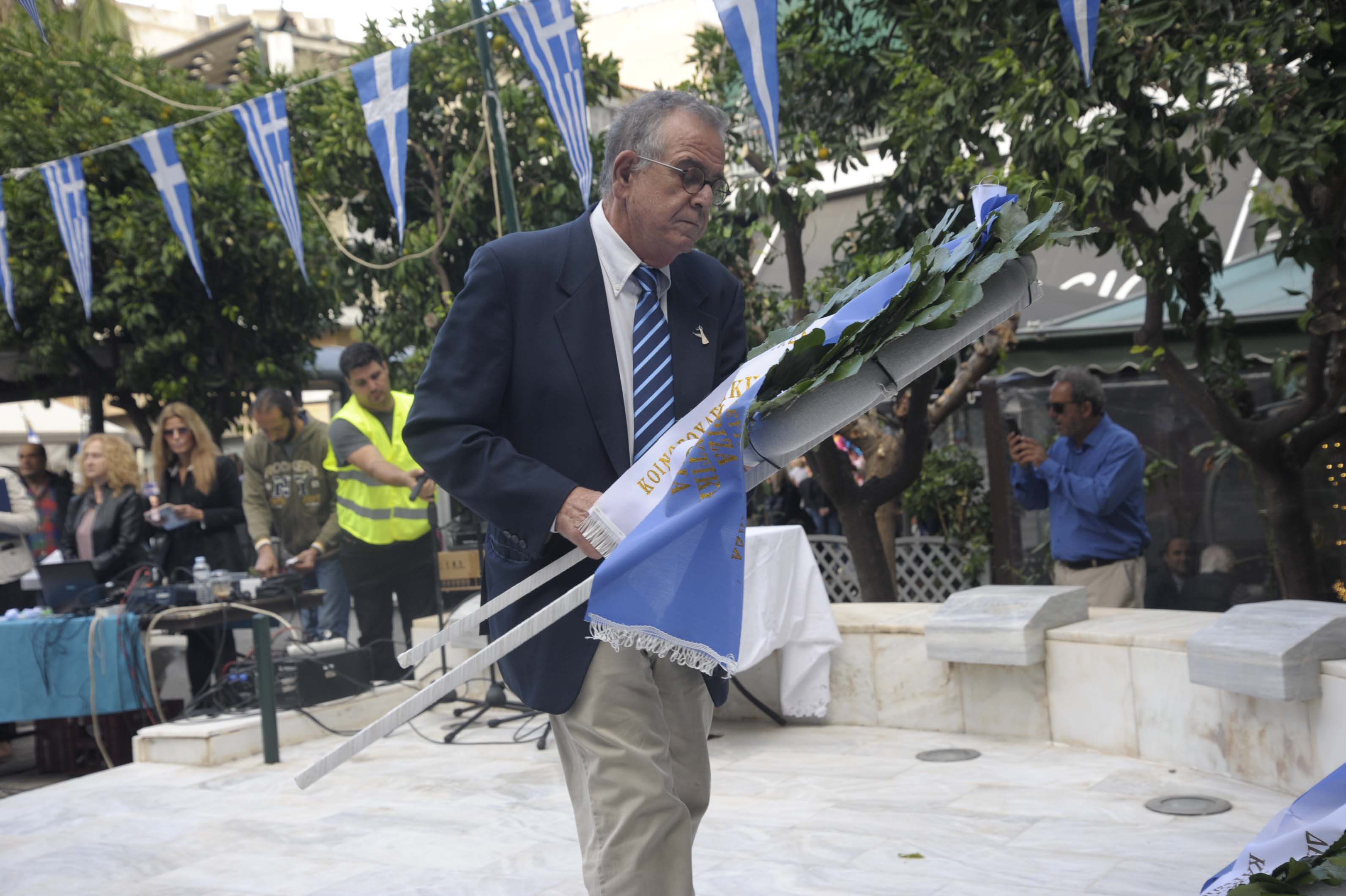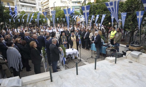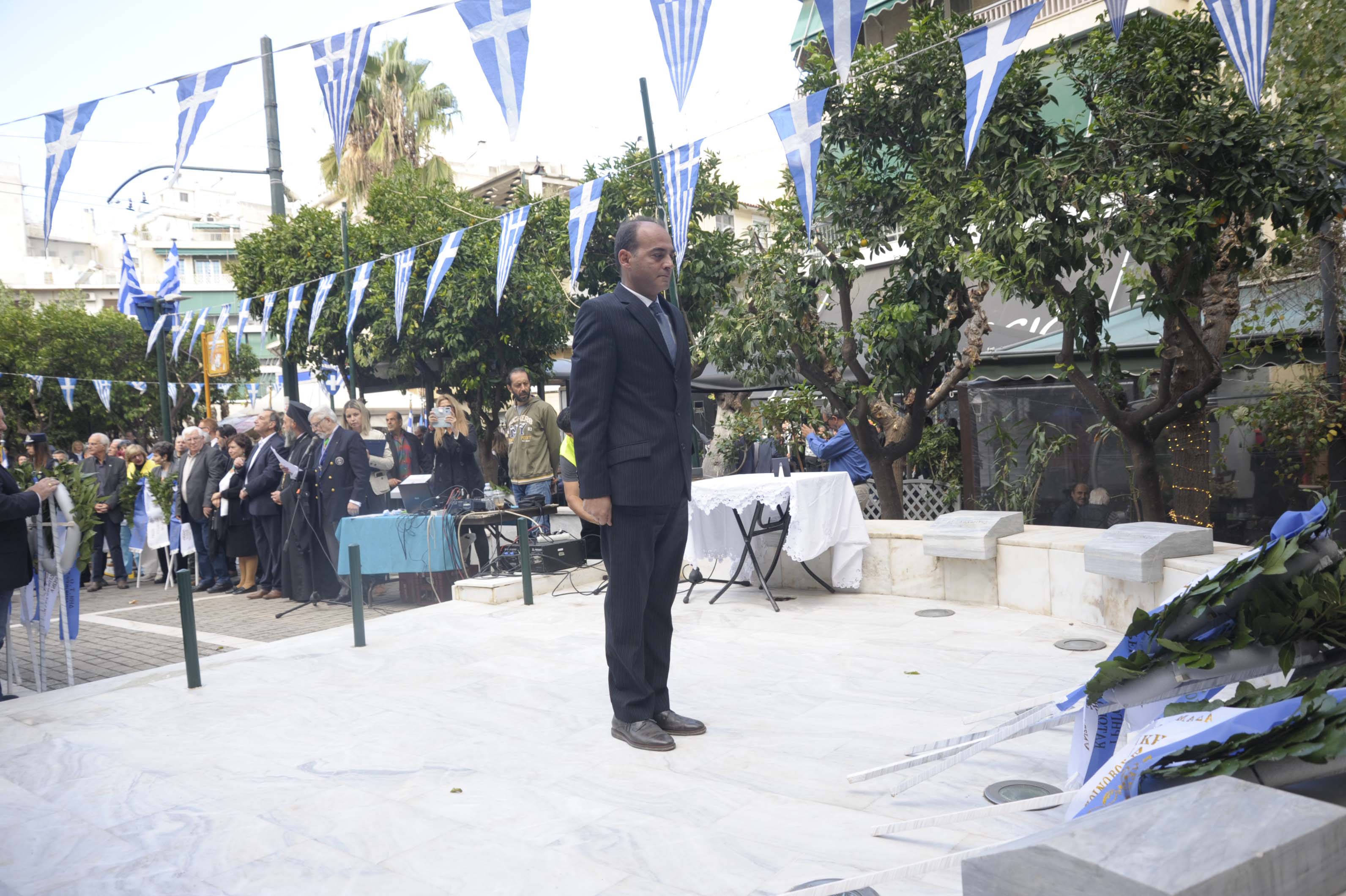 Στη συνέχεια το επίκεντρο του εορτασμού μεταφέρθηκε στο Μνημείο Ηρώων, στην πλατεία Χρυσοστόμου Σμύρνης, όπου πραγματοποιήθηκε στις 11.00 επιμνημόσυνη δέηση στο Μνημείο της Εθνικής Αντίστασης από τον Πανοσιολογιώτατο Αρχιμανδρίτη κ. Χριστόδουλο Κοτσίφη.