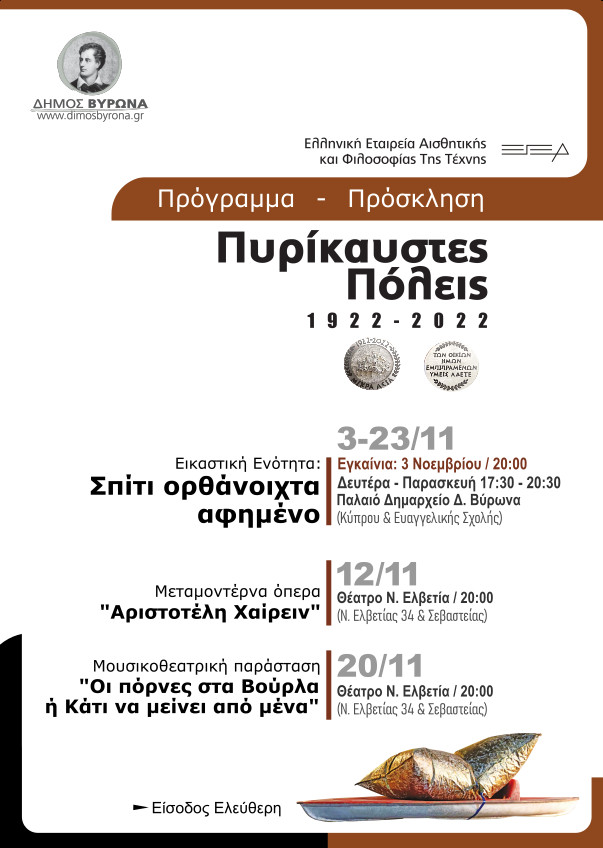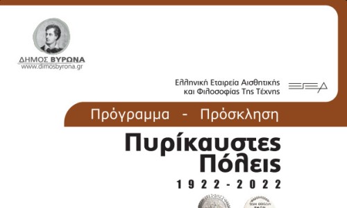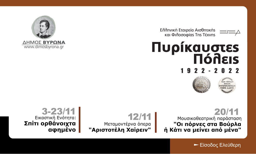 Ο Δήμος Βύρωνα σε συνεργασία με την Ελληνική Εταιρεία Αισθητικής (Ίδρυμα Μιχελή) οργανώνουν μια σειρά εκδηλώσεων Μνήμης για τα 100 χρόνια από την Καταστροφή της Σμύρνης (1922-2022) με τίτλο “Πυρίκαυστες Πόλεις”.