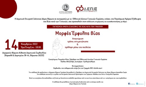 Η Δημοτική Επιτροπή Ισότητας Δήμου Βύρωνα (Δ.ΕΠ.ΙΣ.) σε συνεργασία με το Ελληνικό Δίκτυο Γυναικών Ευρώπης, σας προσκαλούν στην εκδήλωση ενημέρωσης και ευαισθητοποίησης με θέμα: «Μορφές Έμφυλης βίας» Αναγνώριση, τρόποι αντιμετώπισης & πρόληψη μέσω της παιδείας.
