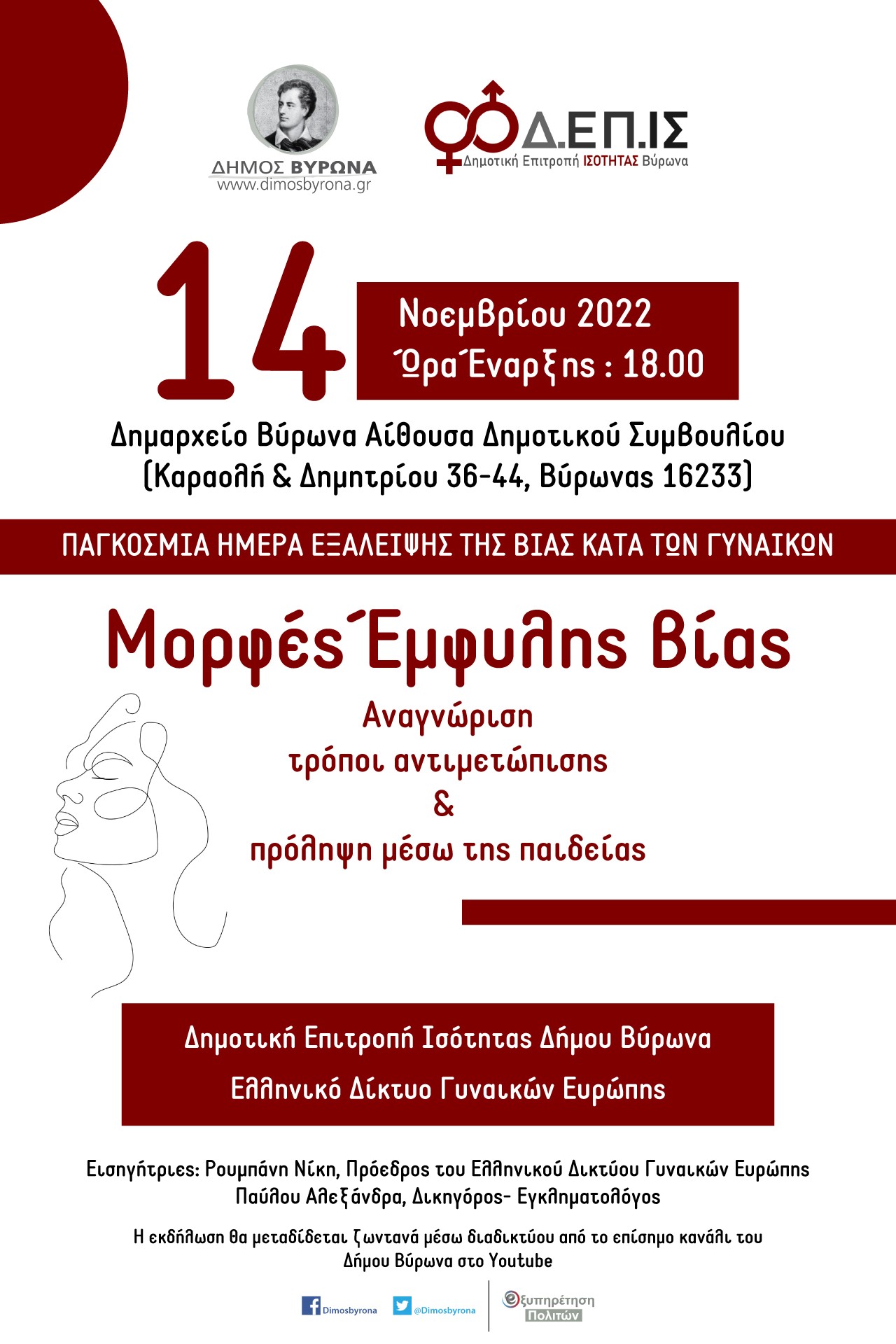 Η εκδήλωση θα γίνει τη Δευτέρα 14 Νοεμβρίου 2022 στις 18.00 στο Δημαρχείο Βύρωνα, Αίθουσα Δημοτικού Συμβουλίου (Καραολή & Δημητρίου 36 – 44, Βύρωνας 16233) και πραγματοποιείται με αφορμή την Παγκόσμια Ημέρα Εξάλειψης της Βίας κατά των Γυναικών (25 Νοεμβρίου).