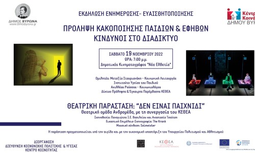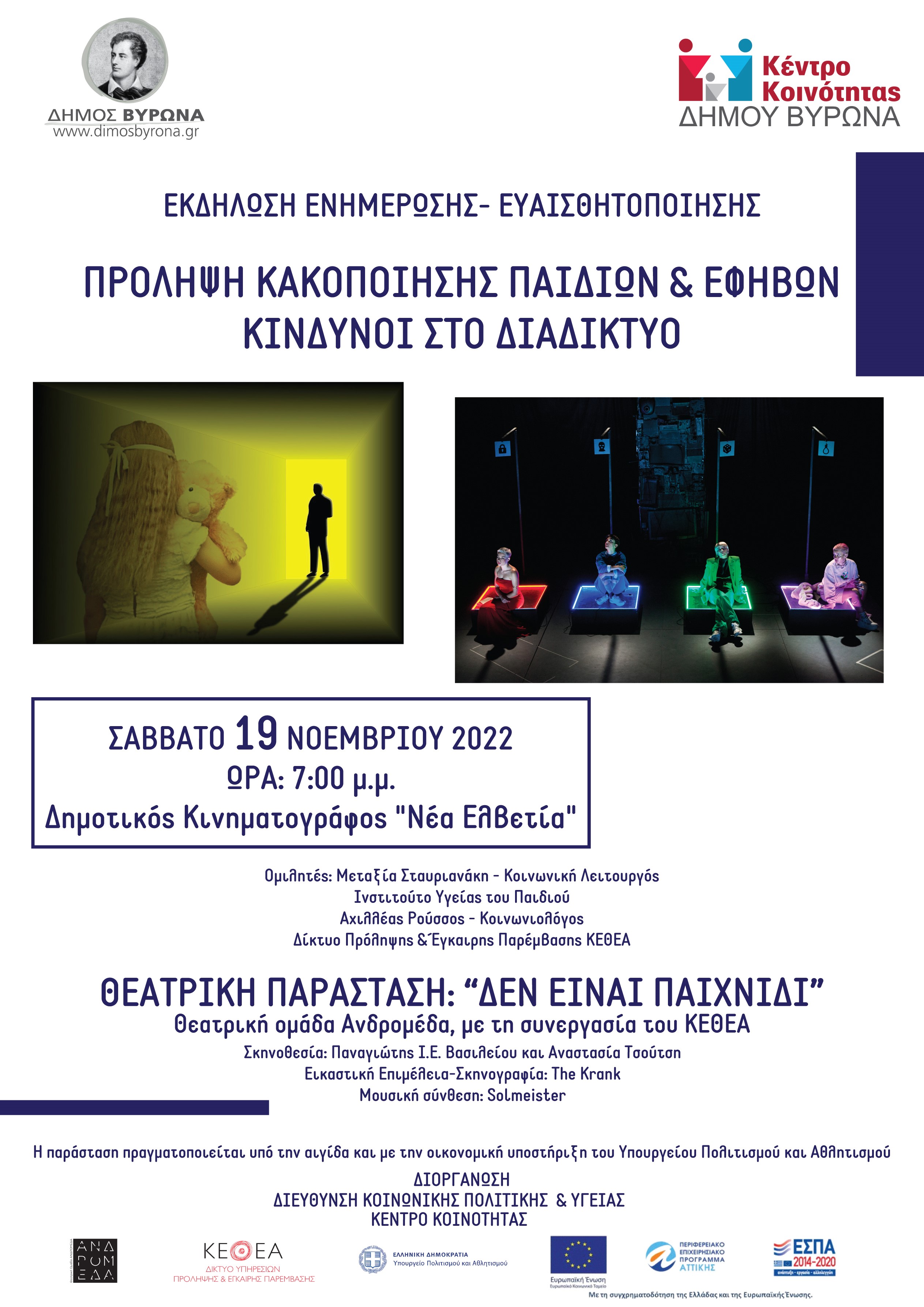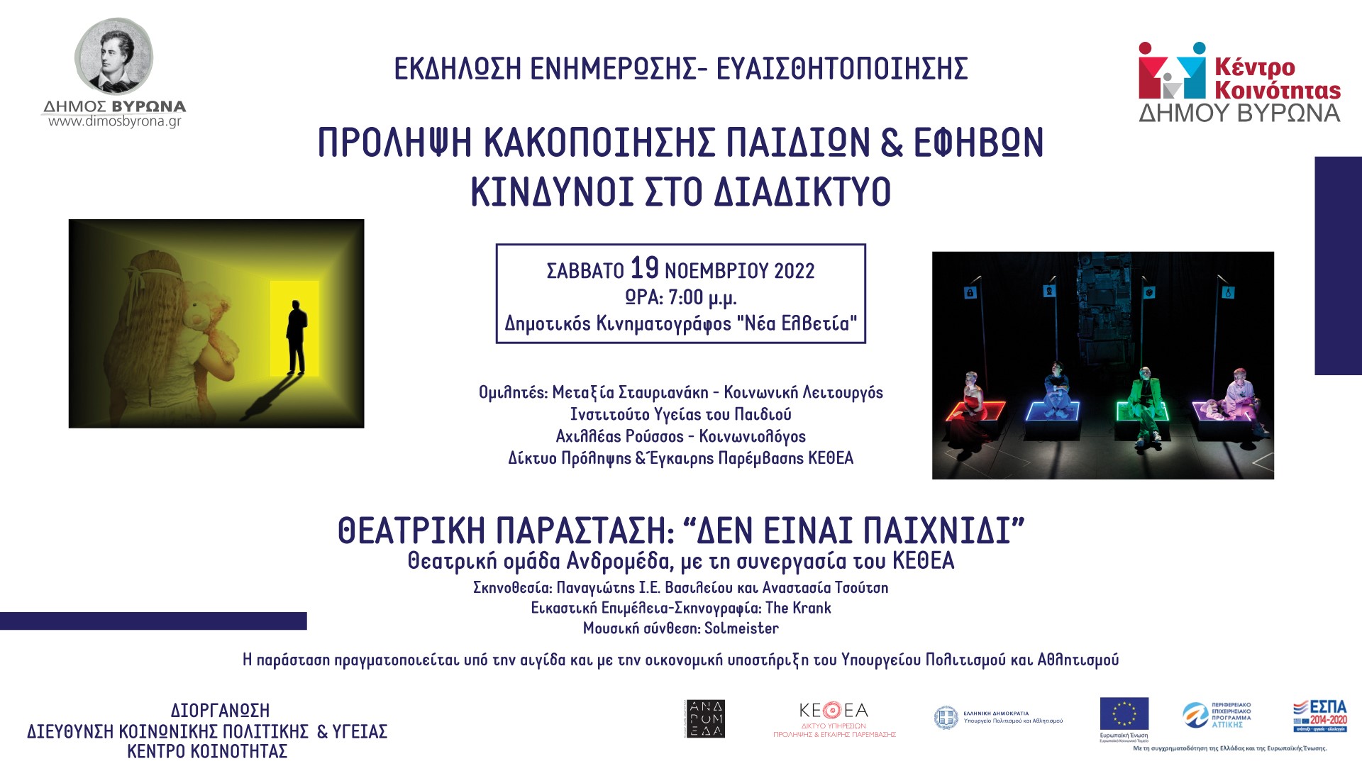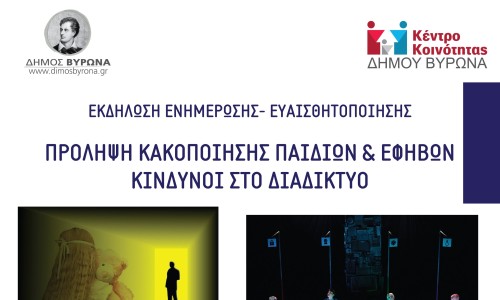 Η Διεύθυνση Κοινωνικής Πολιτικής &Υγείας και το Κέντρο Κοινότητας Δήμου Βύρωνα, με αφορμή την παγκόσμια ημέρα κατά της παιδικής κακοποίησης στις 19 Νοέμβρη, σας προσκαλούν στην εκδήλωση ενημέρωσης ευαισθητοποίησης με τίτλο: “ΠΡΟΛΗΨΗ ΚΑΚΟΠΟΙΗΣΗΣ ΠΑΙΔΙΩΝ & ΕΦΗΒΩΝ – ΑΣΦΑΛΗΣ ΠΛΟΗΓΗΣΗ ΣΤΟ ΔΙΑΔΙΚΤΥΟ”, το Σάββατο 19/11, στο Δημοτικό Κινηματογράφο "Νέα Ελβετία", ώρα 7:00μ.μ.