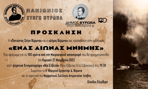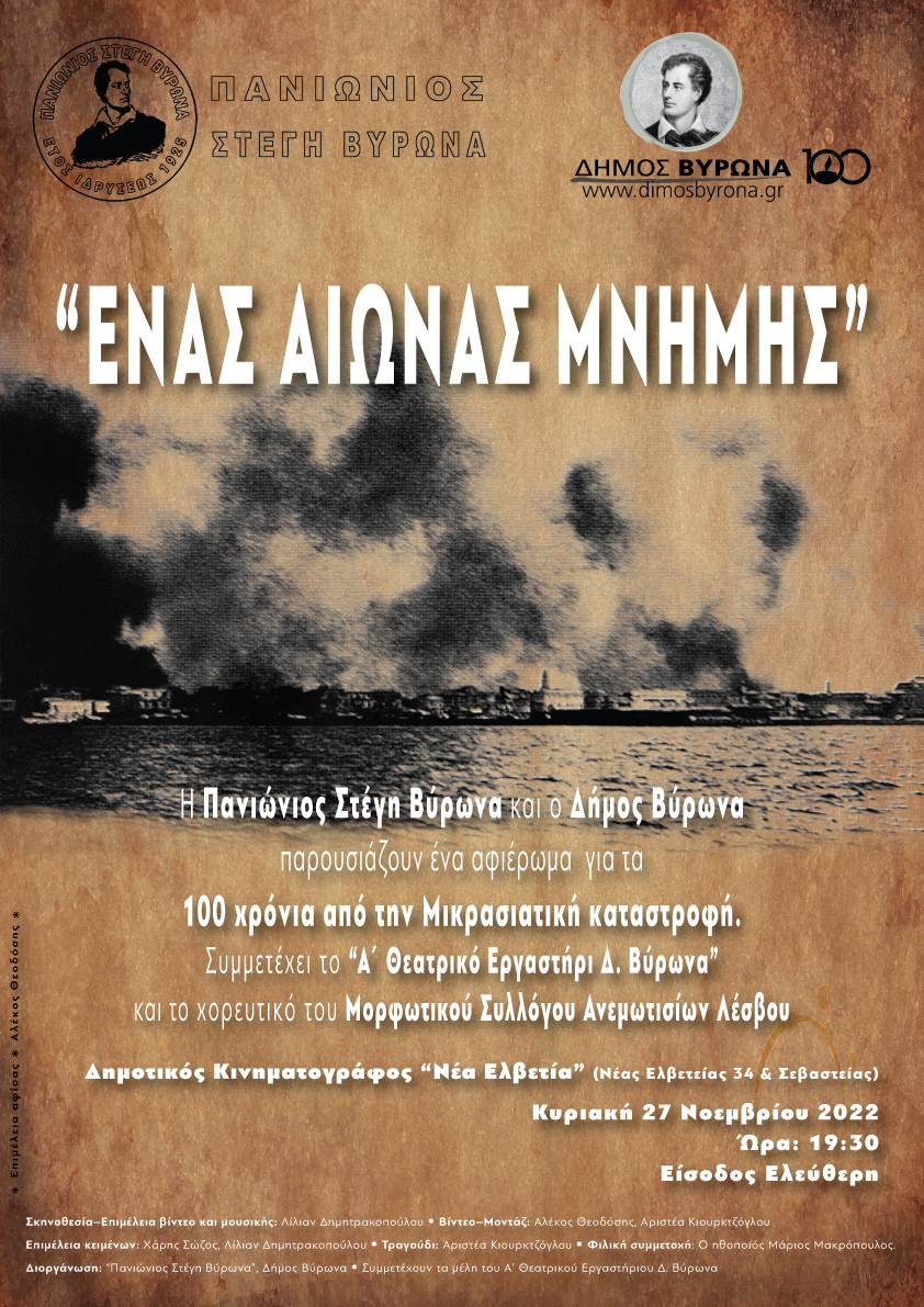 Η «ΠΑΝΙΩΝΙΟΣ ΣΤΕΓΗ ΒYΡΩΝΑ» και ο ΔΗΜΟΣ ΒΥΡΩΝΑ, παρουσιάζουν ένα αφιέρωμα μνήμης, για τα εκατό χρόνια από την μικρασιατική καταστροφή, με γενικό τίτλο: «ΕΝΑΣ ΑΙΩΝΑΣ ΜΝΗΜΗΣ».