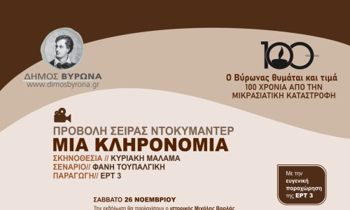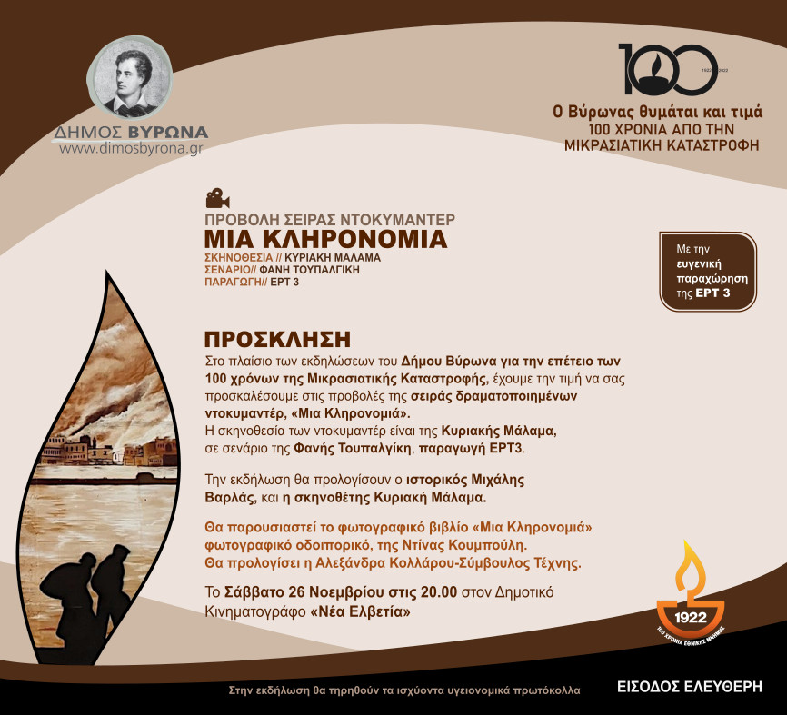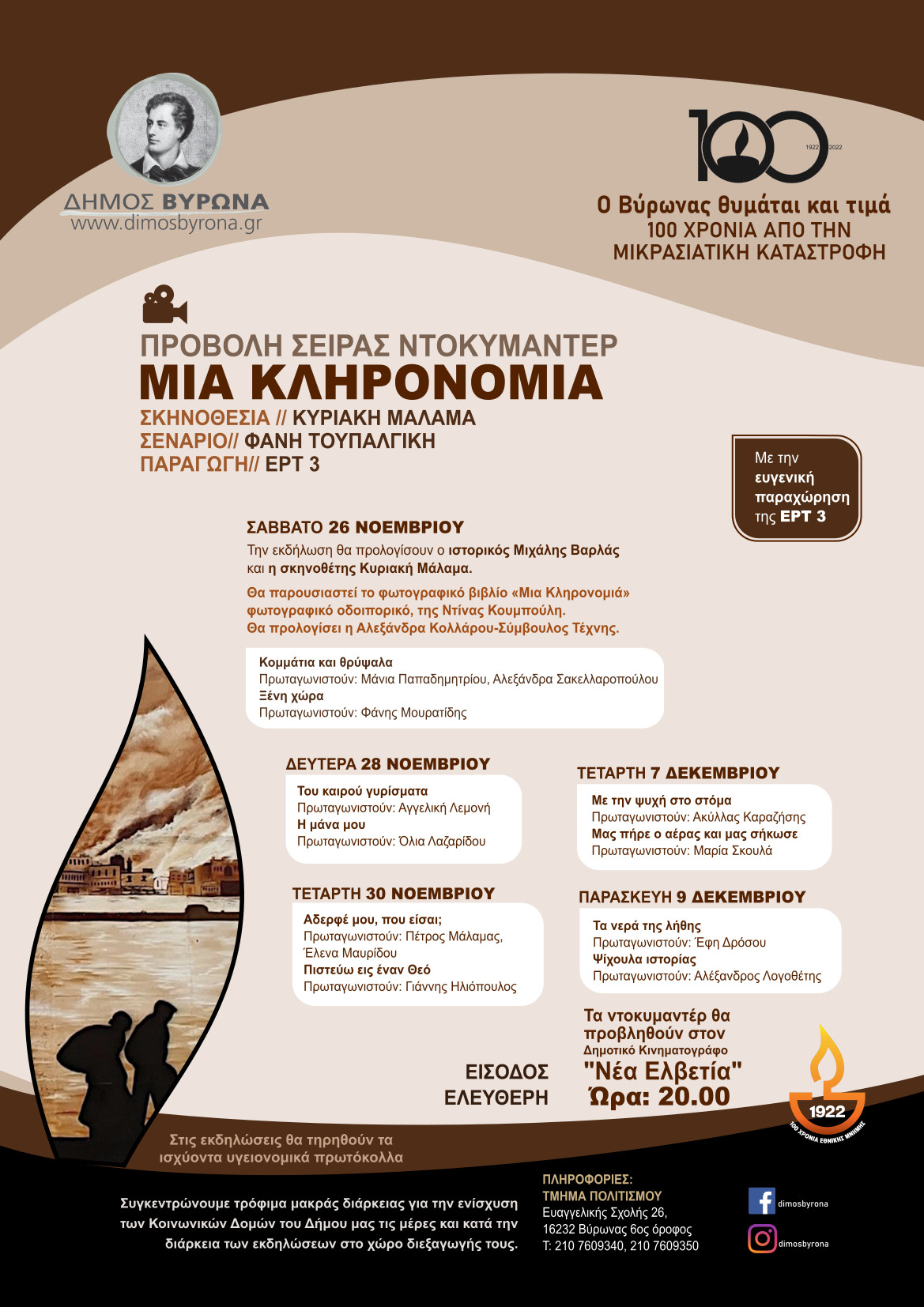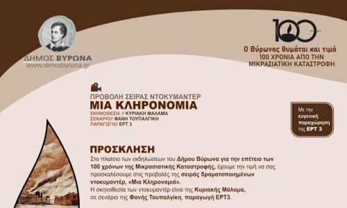 Ο Δήμος Βύρωνα, τιμώντας τα 100 χρόνια από την Μικρασιατική Καταστροφή, παρουσιάζει στον Δημοτικό Κινηματογράφο “Νέα Ελβετία” μια σειρά ντοκιμαντέρ 10 επεισοδίων - με την ευγενική παραχώρηση της ΕΡΤ 3- με τίτλο “Μια κληρονομία” σε σκηνοθεσία Κυριακής Μάλαμα και σενάριο Φανής Τουπαλγίκη.