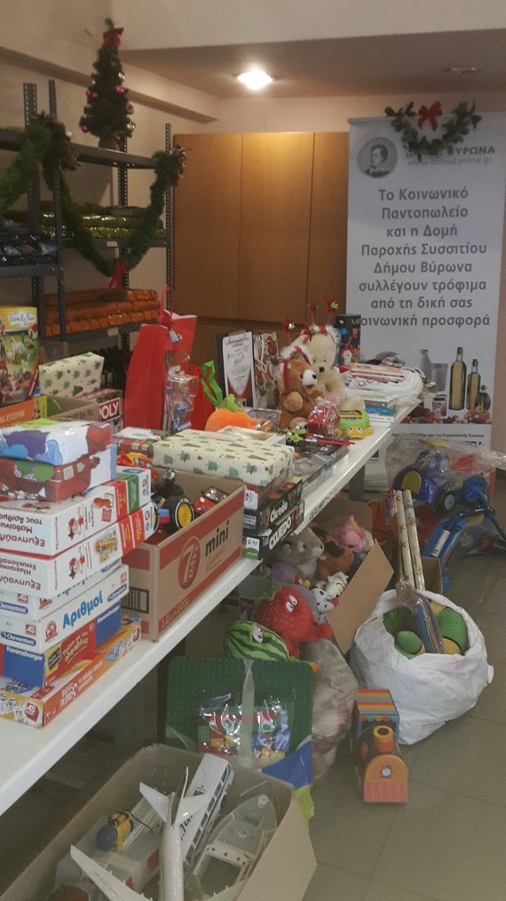 Στο πλαίσιο της κοινωνικής πολιτικής του Δήμου Βύρωνα, οι Δομές Παροχής Βασικών Αγαθών «Παροχή Συσσιτίου» & «Κοινωνικό Παντοπωλείο» με μέριμνα της Κοινωνικής Υπηρεσίας και της Δημοτικής Αρχής, πραγματοποίησαν σειρά δράσεων προκειμένου να συνεχιστεί η προσπάθεια για κοινωνική προσφορά απέναντι σε συνανθρώπους μας που χρήζουν βοήθειας και συμπαράστασης και να δοθεί χαρά στα παιδιά.