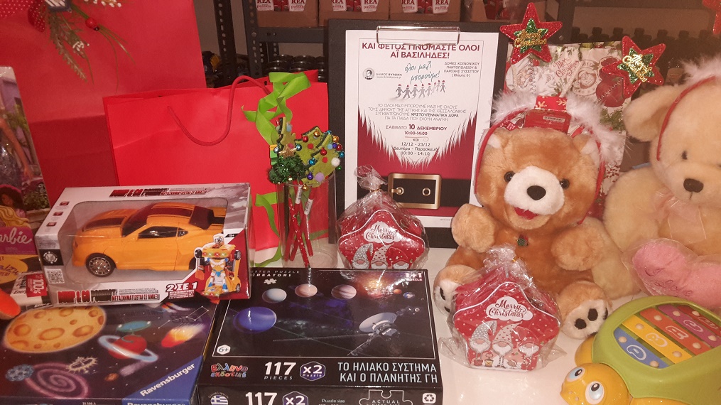 Το Σάββατο 10/12 με την υποστήριξη του ΟΛΟΙ ΜΑΖΙ ΜΠΟΡΟΥΜΕ, καθώς και τις επόμενες ημέρες από 12 έως και 23/12, συγκεντρώθηκαν Χριστουγεννιάτικα δώρα τα οποία διανεμήθηκαν παραμονές Χριστουγέννων στα ανήλικα μέλη των οικογενειών των δικαιούχων των Κοινωνικών Δομών μαζί με εορταστικά γλυκά.