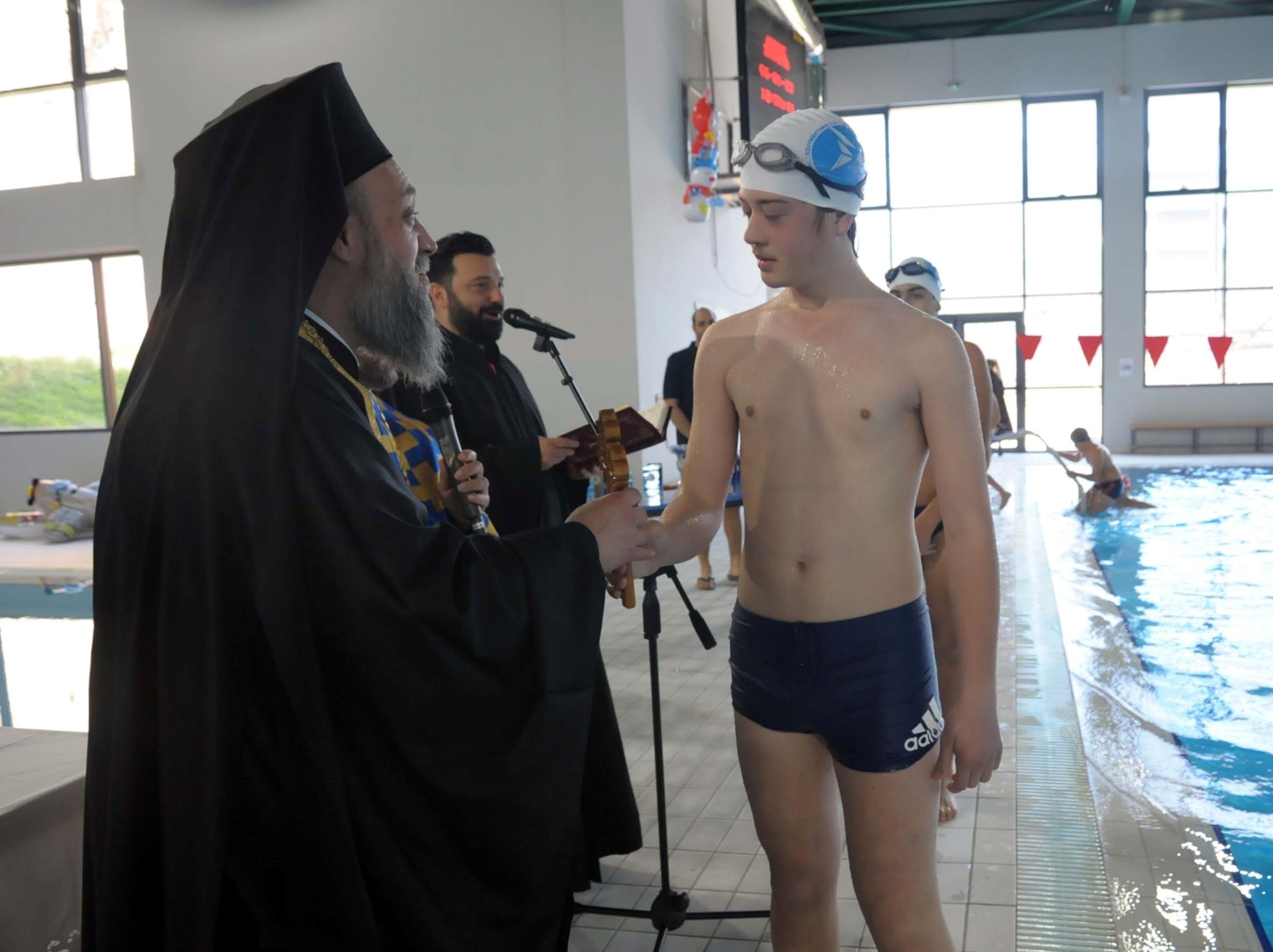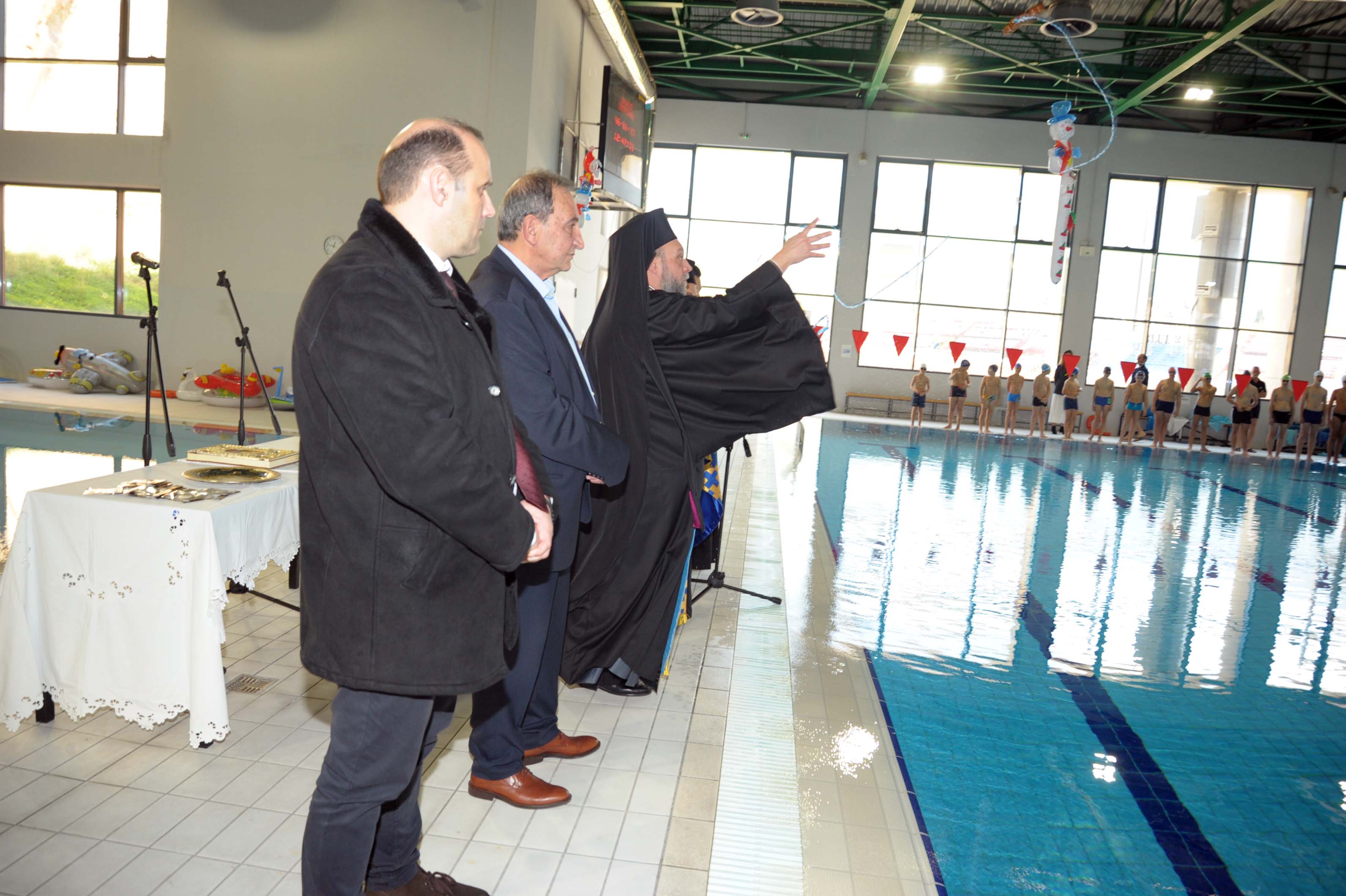 Με τη λαμπρότητα αλλά και τη σεμνότητα που αρμόζουν στην ημέρα, εορτάστηκαν τα Άγια Θεοφάνια στο Δημοτικό κολυμβητήριο Βύρωνα, «Χρήστος Ταμπαξής». Την ακολουθία του Αγιασμού των υδάτων τέλεσε ο Πανοσιολογιώτατος Αρχιμανδρίτης Πατέρας Χριστόδουλος. Σύντομο χαιρετισμό απηύθυνε ο Δήμαρχος Βύρωνα, Γρηγόρης Κατωπόδης.