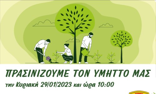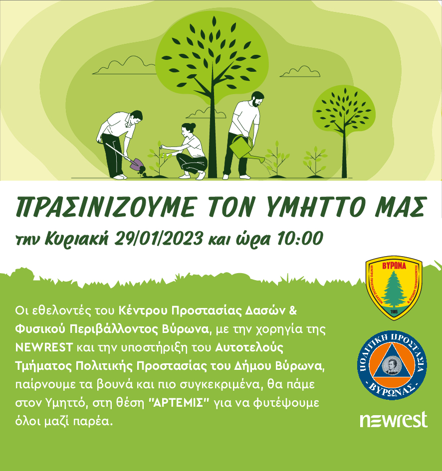 Δενδροφυτεύση πραγματοποιήθηκε την Κυριακή 29/01/2023 από την εθελοντική ομάδα του «Κέντρου Προστασίας Δασών & Φυσικού Περιβάλλοντος Βύρωνα» με την υποστήριξη του Αυτοτελούς Τμήματος Πολιτικής Προστασίας του δήμου μας και την χορηγία της εταιρίας NEWREST στην τοποθεσία «ΑΡΤΕΜΙΣ».