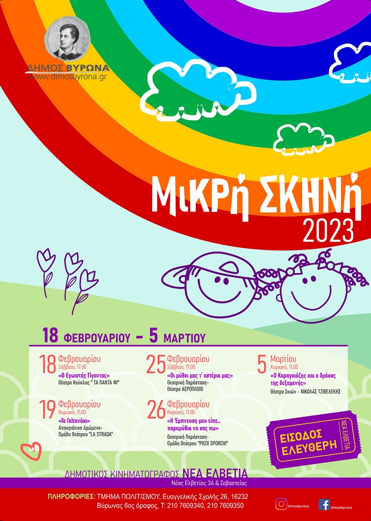 Η «Μικρή Σκηνή» ανοίγει την αυλαία της το Σαββατοκύριακο 18 & 19 Φεβρουαρίου στον Δημοτικό Κινηματογράφο «Νέα Ελβετία» (Νέας Ελβετίας 34 & Σεβαστείας) και περιμένει τους μικρούς και μεγάλους φίλους να παρακολουθήσουν, δωρεάν, τις παραστάσεις της.