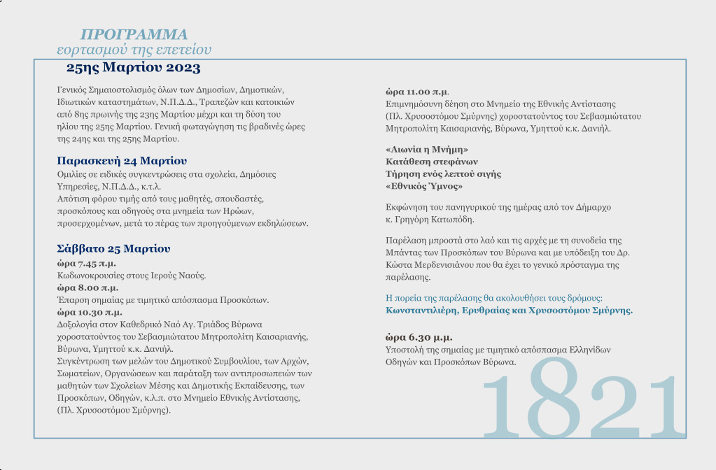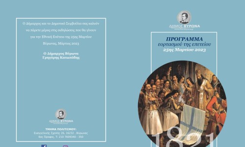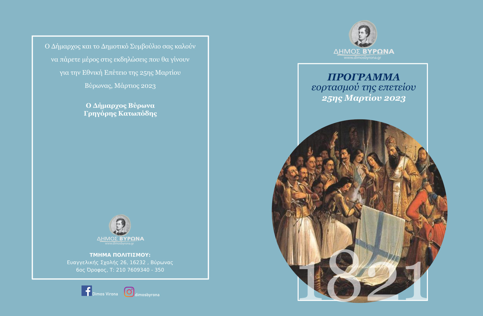 Το πρόγραμμα εορτασμού της 25ης Μαρτίου 2023, το ερχόμενο Σάββατο, στο Δήμο Βύρωνα, περιλαμβάνει τα εξής: