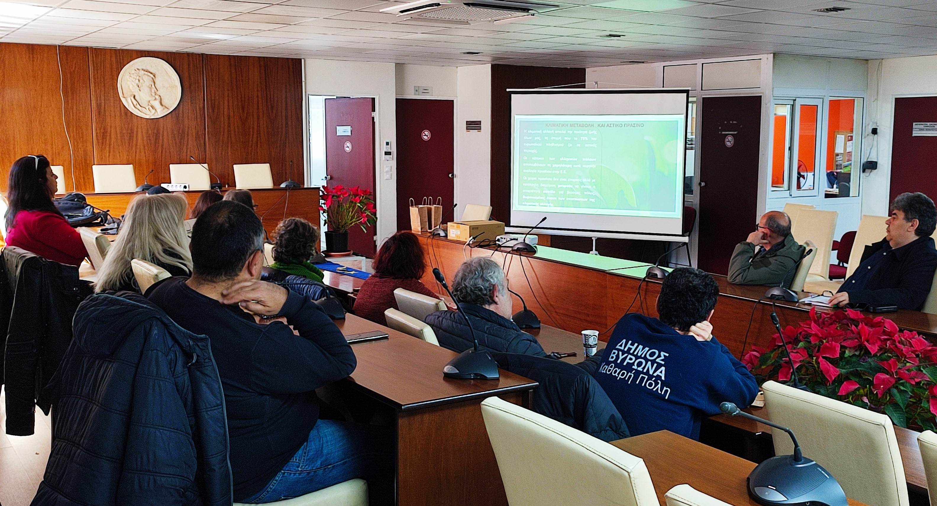 Η Διεύθυνση Πράσινου του Δήμου Βύρωνα σε συνεργασία με την ομάδα του έργου LIFE GrIn, οργάνωσε την Τετάρτη 29/3/2023 στην αίθουσα του δημοτικού συμβουλίου, εκπαιδευτική συνάντηση, με θέμα την Θεσμοθέτηση της Διαχείρισης Αστικού Πρασίνου για την προσαρμογή στην Κλιματική Αλλαγή.