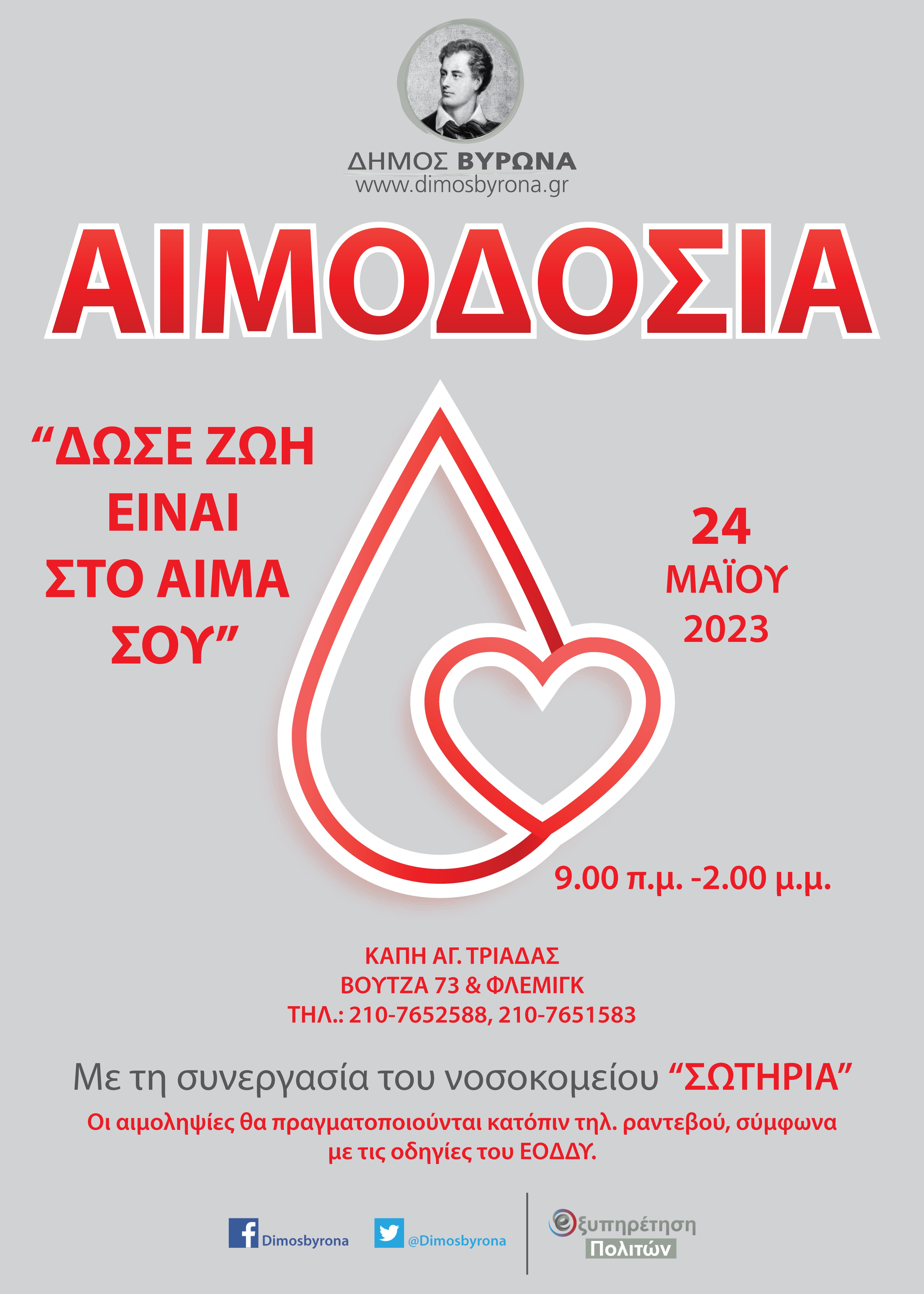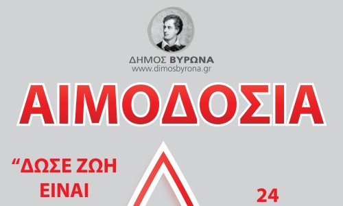 Σας προσκαλούμε να συμμετάσχετε στην εθελοντική αιμοδοσία που διοργανώνει ο Δήμος Βύρωνα σε συνεργασία με το νοσοκομείο Γ.Ν.Α ΣΩΤΗΡΙΑ για την ενίσχυση της δημοτικής τράπεζας αίματος.
