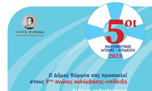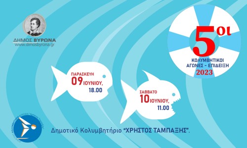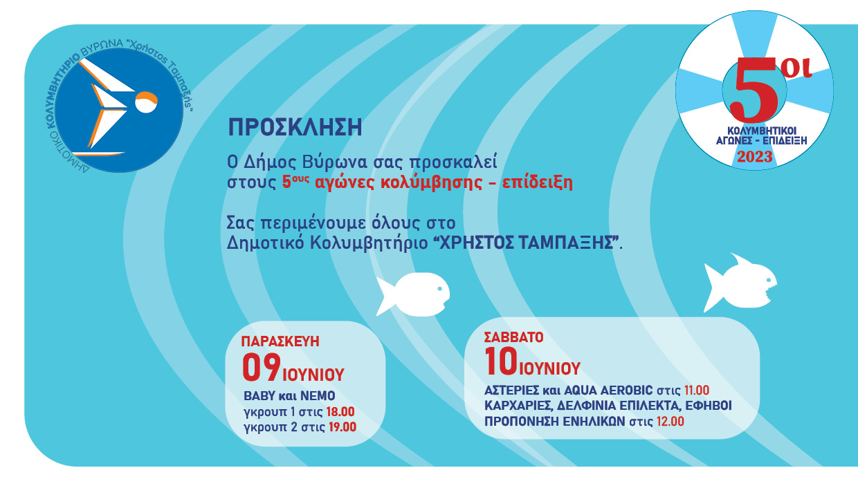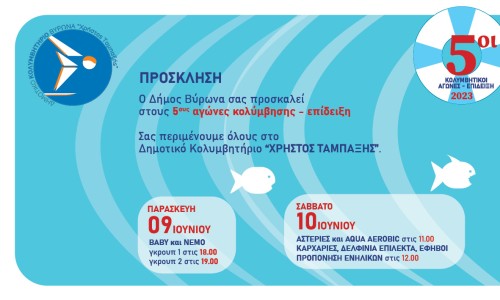 Με ιδιαίτερη χαρά ο Δήμος Βύρωνα σας προσκαλεί, στους 5ους Αγώνες κολύμβησης - επίδειξη, οι οποίοι θα πραγματοποιηθούν την Παρασκευή 9/6 και το Σάββατο 10/6.
