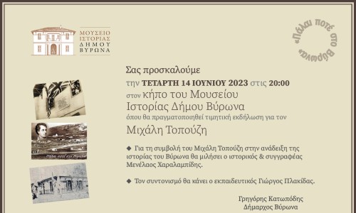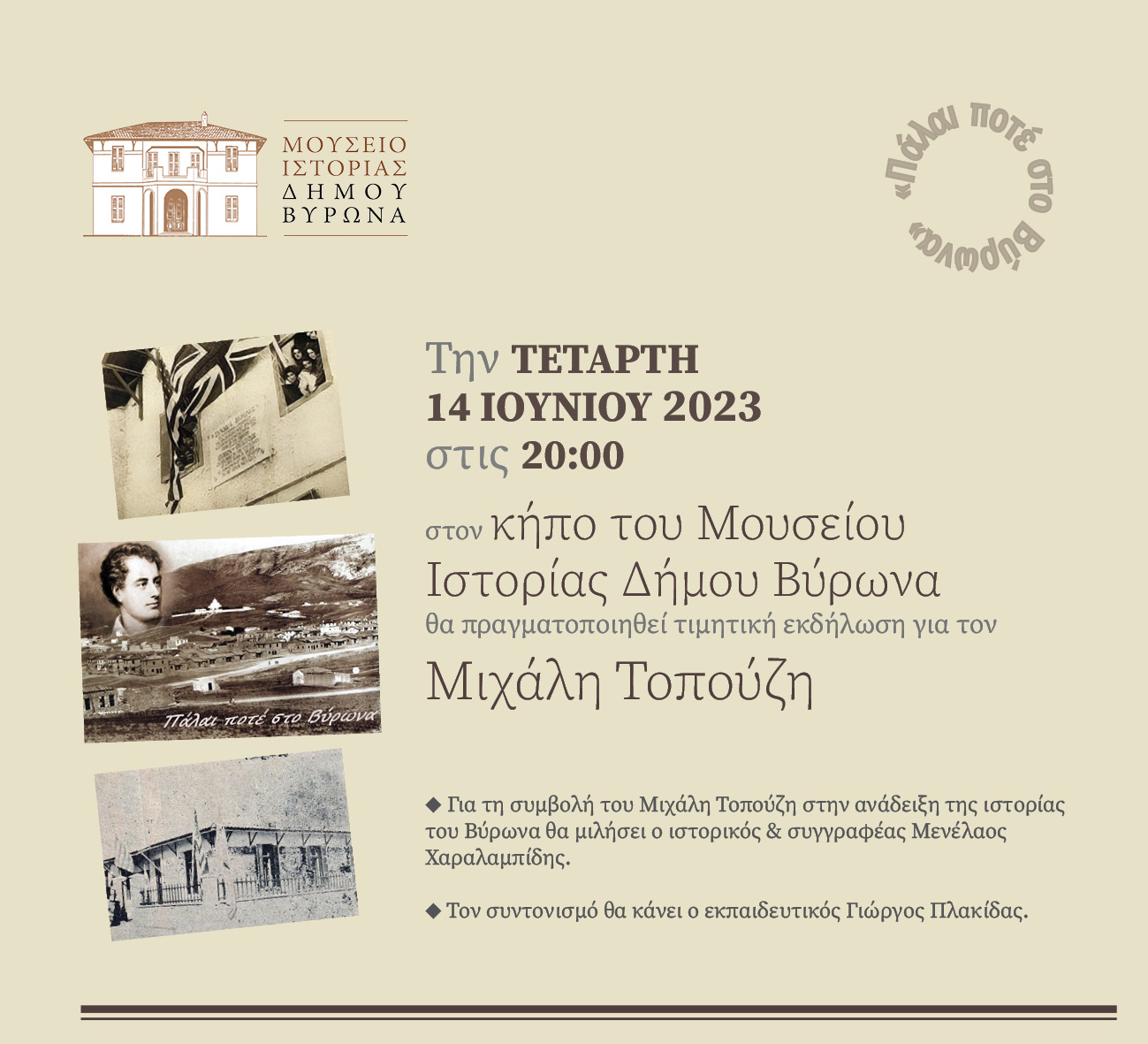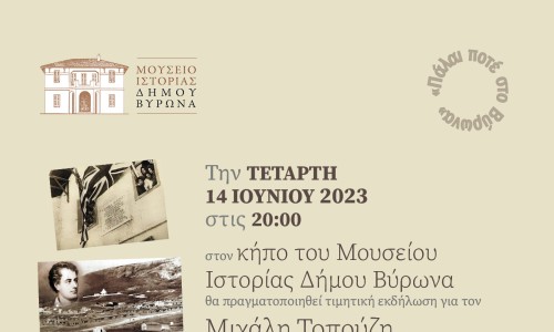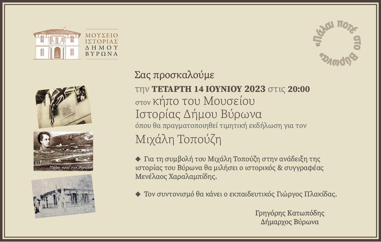 Την Τετάρτη 14 Ιουνίου 2023 στις 20.00 στον κήπο του Μουσείου Ιστορίας Δήμου Βύρωνα (Παλαιό Δημαρχείο) θα πραγματοποιηθεί τιμητική εκδήλωση για τον Μιχάλη Τοπούζη.