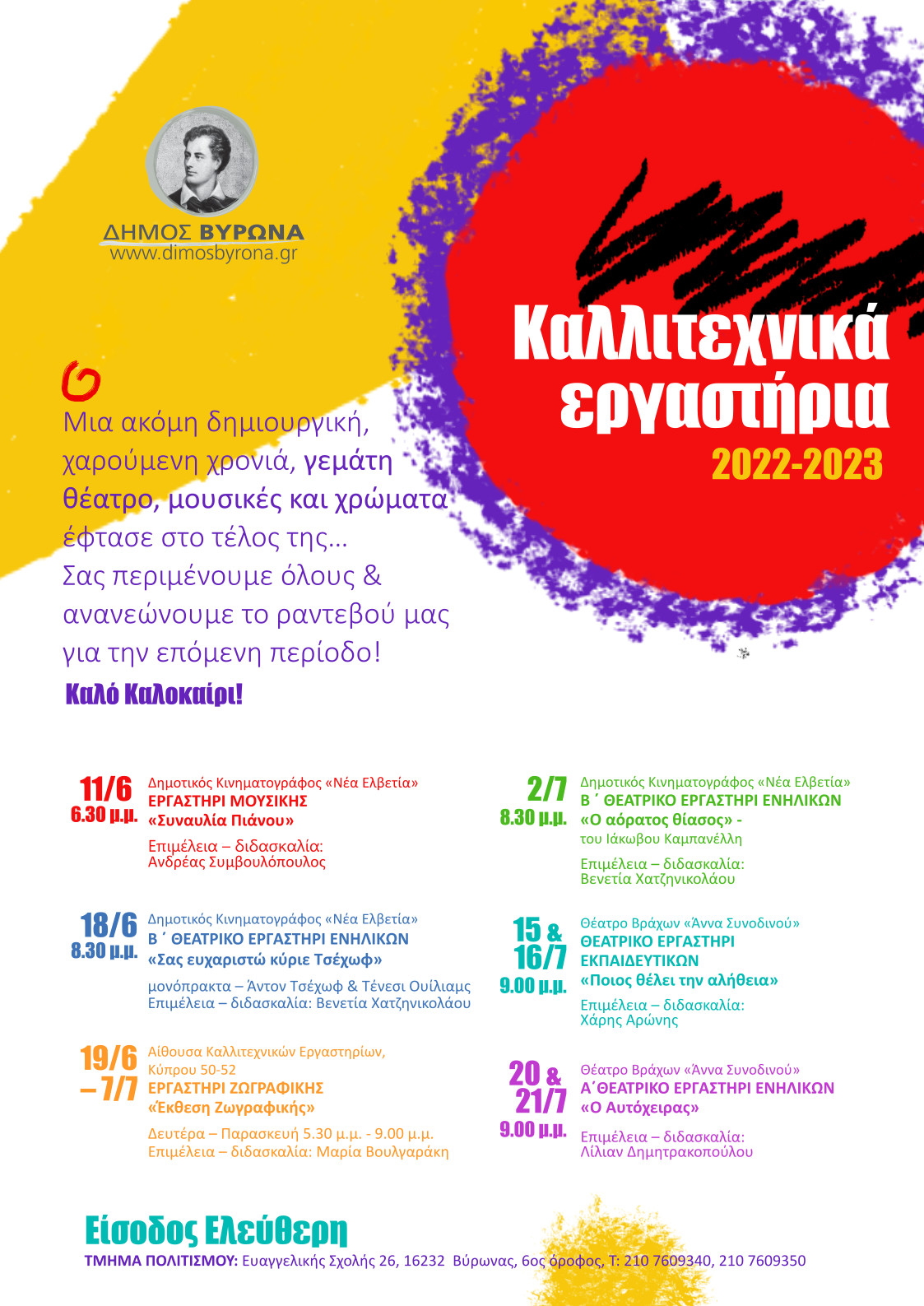 Οι μαθητές των Καλλιτεχνικών Εργαστηρίων Βύρωνα μαζί με τους καθηγητές τους έχουν τη χαρά να σας προσκαλέσουν στις ετήσιες γιορτές που οργανώνουν, όπου θα παρουσιάσουν μουσικές και θεατρικές παραστάσεις, καθώς επίσης και τις ζωγραφικές δημιουργίες τους.