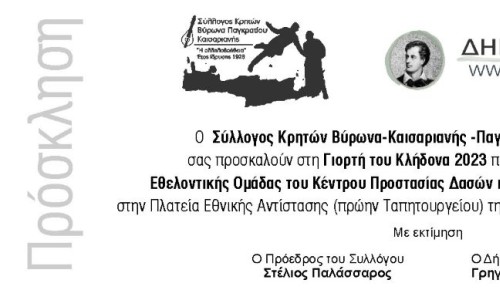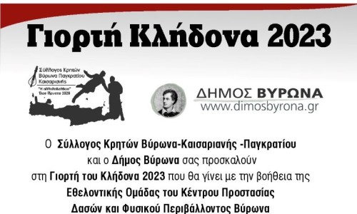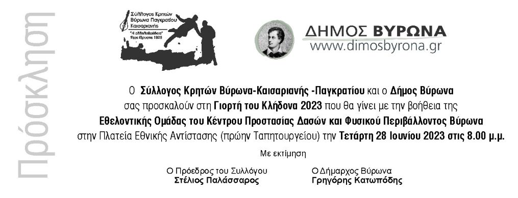 Σας προσκαλούμε στη Γιορτή του Κλήδονα που οργανώνει ο Δήμος Βύρωνα και ο Σύλλογος Κρητών Βύρωνα-Καισαριανής-Παγκρατίου, την Τετάρτη 28 Ιουνίου 2023, στις 8.00 μ.μ. στην Πλατεία Εθνικής Αντίστασης (πρώην Ταπητουργείου).