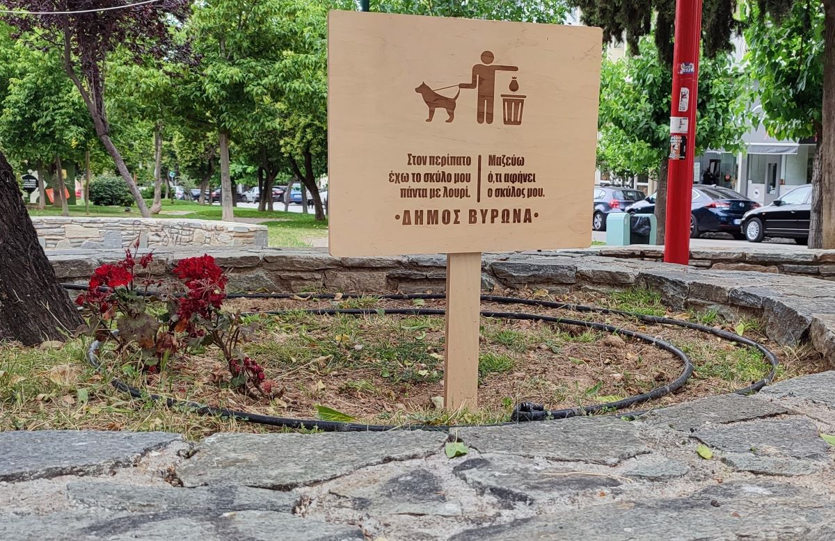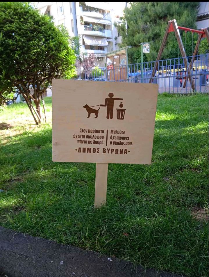 Ξύλινες ταμπέλες που αφορούν στις υποχρεώσεις των συνοδών σκύλων, όταν κυκλοφορούν στην πόλη με τα ζώα τους, τοποθέτησε η Διεύθυνση Πρασίνου του Δήμου Βύρωνα, στα αλσύλια και τα πάρκα.