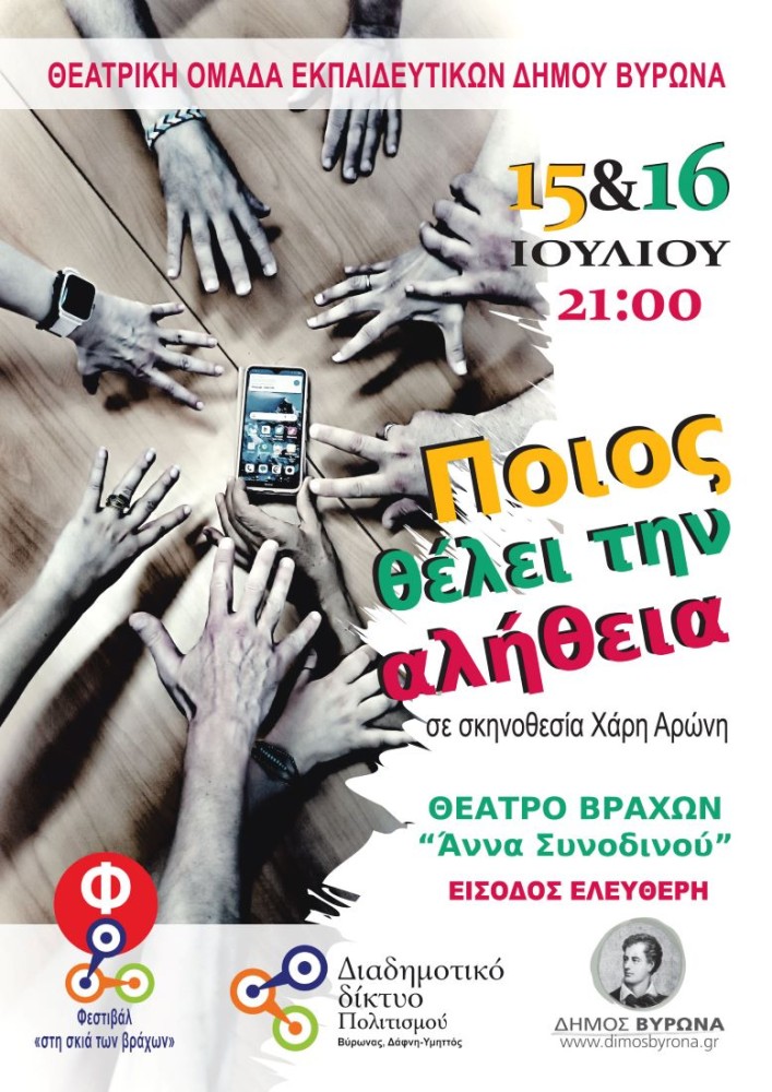 Η Θεατρική Ομάδα Εκπαιδευτικών Δήμου Βύρωνα παρουσιάζει τη θεατρική παράσταση «Ποιος θέλει την αλήθεια;» μία πρωτότυπη διασκευή του θεατρικού του Πάολο Τζενοβέζε «Τέλειοι ξένοι» σε σκηνοθεσία - σκηνογραφία του Χάρη Αρώνη, το Σάββατο 15 και την Κυριακή 16 ΙΟΥΛΙΟΥ στο Θέατρο Βράχων "Άννα Συνοδινού". Είσοδος Ελεύθερη