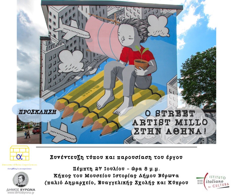 Το Ιταλικό Μορφωτικό Ινστιτούτο Αθηνών, σε συνεργασία με τον Δήμο Βύρωνα και την Awesome Athens Experiences, έχει τη χαρά να σας ενημερώσει ότι, από τις 24 έως τις 28 Ιουλίου 2023 ο Ιταλός καλλιτέχνης Francesco Camillo Giorgino, γνωστός ως MILLO, θα βρίσκεται στην Αθήνα και θα πραγματοποιήσει μια τοιχογραφία στο Δήμο Βύρωνα, το περιεχόμενο της οποία θα παρουσιαστεί δημόσια στις 27 Ιουλίου.
