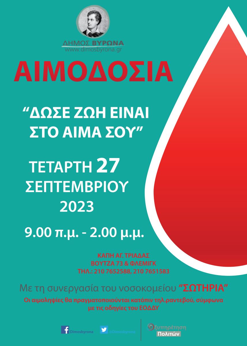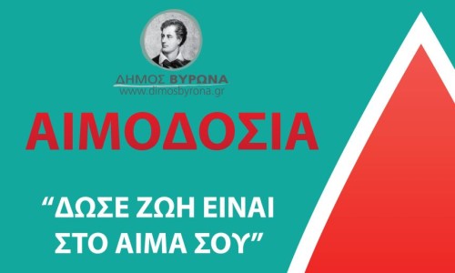 Σας προσκαλούμε να συμμετάσχετε στην εθελοντική αιμοδοσία που διοργανώνει ο Δήμος Βύρωνα σε συνεργασία με το νοσοκομείο Γ.Ν.Α “ Η ΣΩΤΗΡΙΑ” για την ενίσχυση της δημοτικής τράπεζας αίματος.